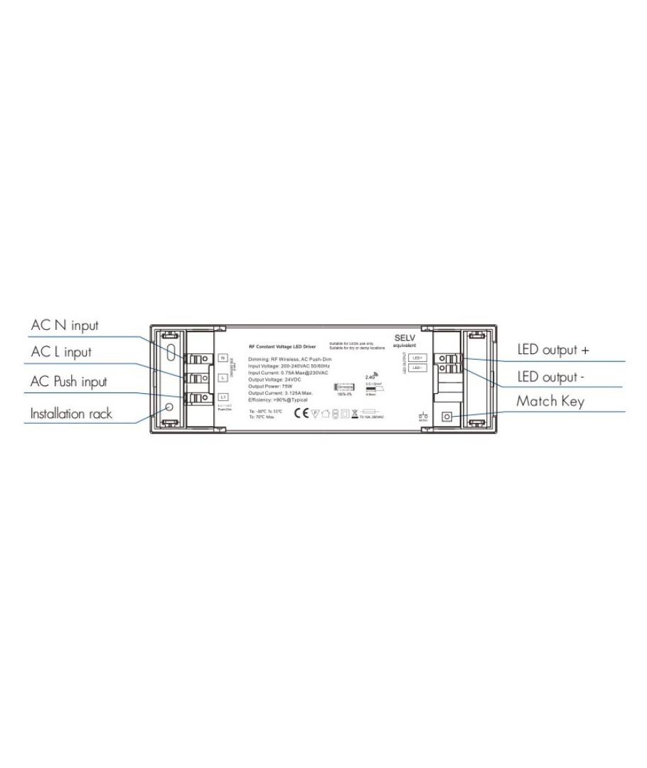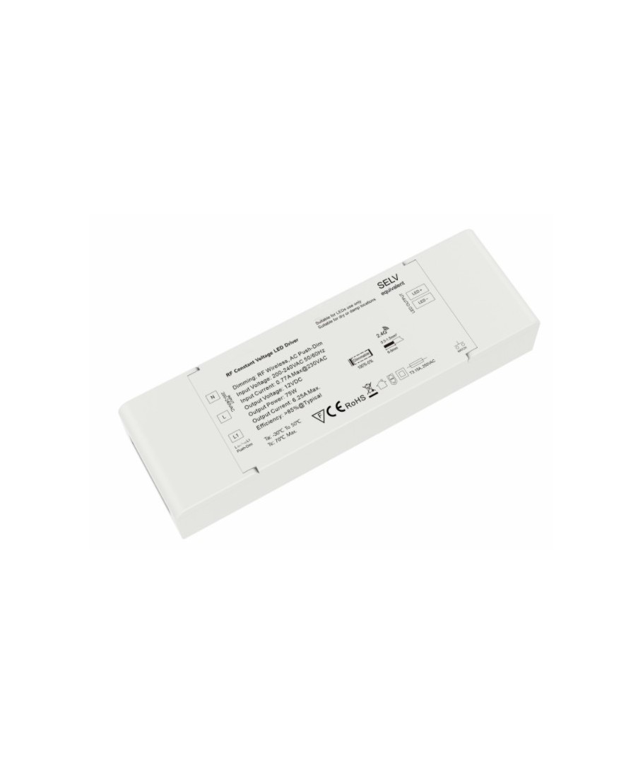 Denna 75W / 12V DC dimbara strömförsörjning är perfekt designad för dina LED-belysningsbehov. Med kapacitet att leverera 6.25A och kapabla till både RF-dimning och push-dim, erbjuder den en flexibel och mångsidig lösning för alla ljussättningsprojekt.