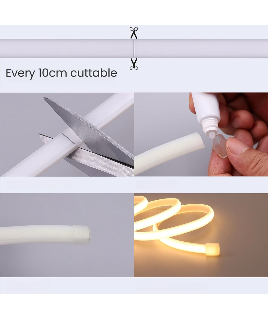 Denna LED-strip har små dimensioner på 10 x 7 mm, vilket gör den enkel att installera och anpassa efter behov. Den kapabla designen tillåter även att strippen kan klippas var 10:e cm, vilket ger maximal flexibilitet för att passa olika projekt och installationer.