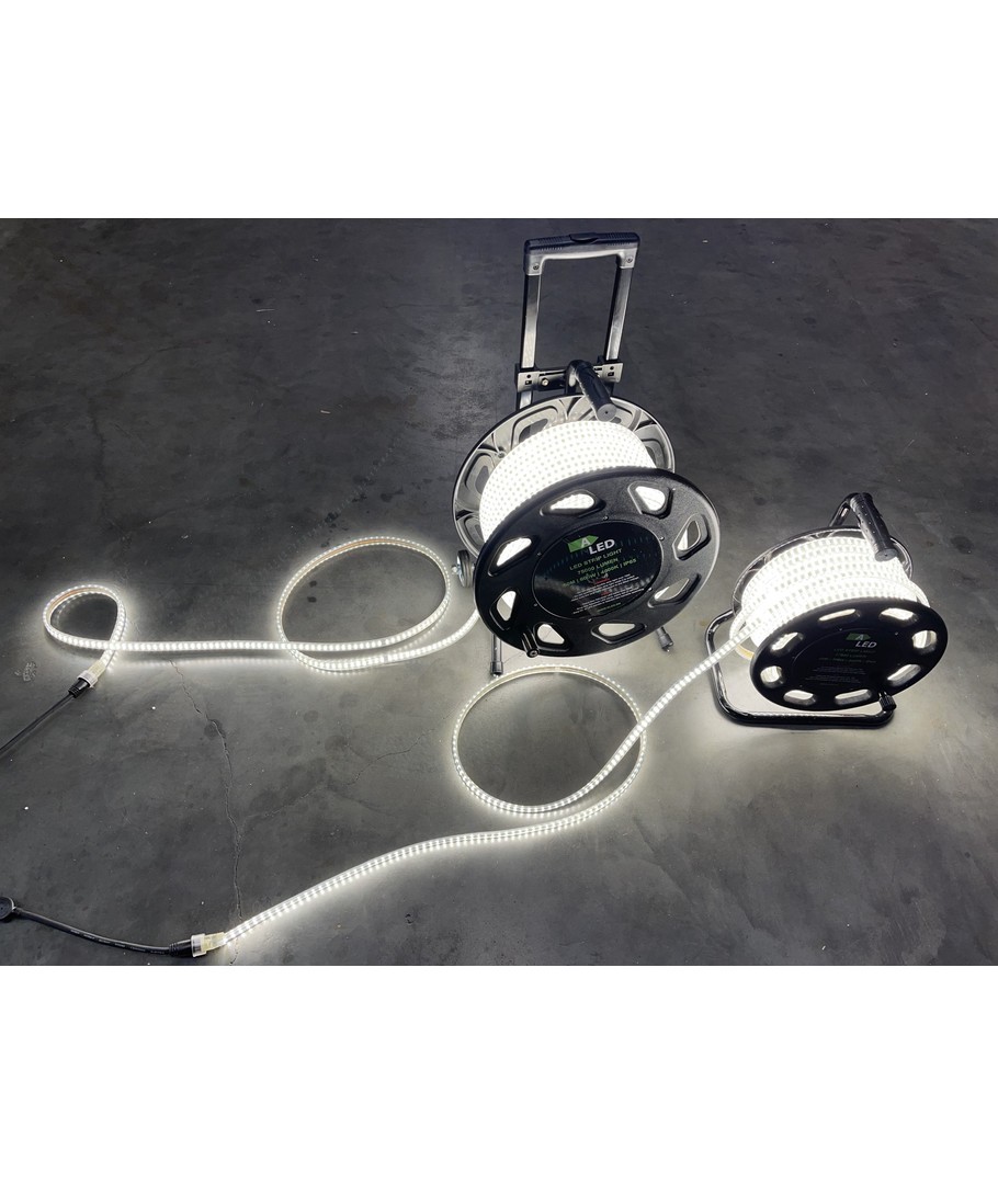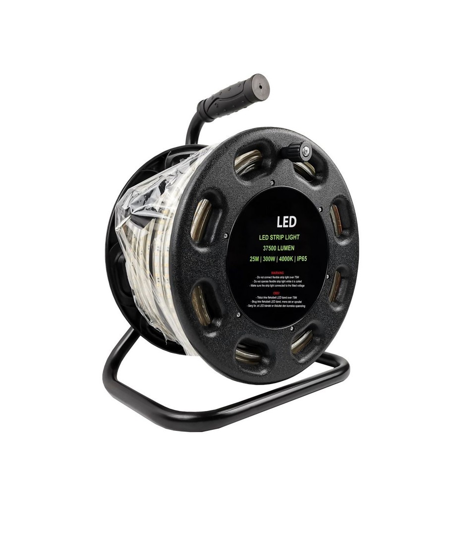 Strippen levereras med trumma och 25 meter LED-strip, dessutom medföljer även en gummikabel med godkänd EU-stickpropp.