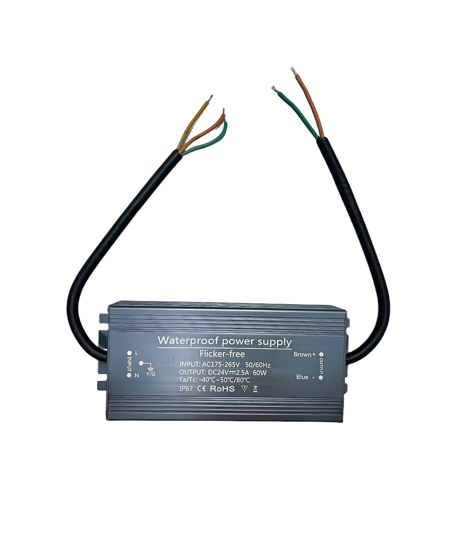 Den nya 60W strömförsörjningen 24V DC - 2,5A levererar pålitlig ström utan flimmer och är perfekt för både inomhus- och utomhusbruk tack vare sin IP67-certifiering.