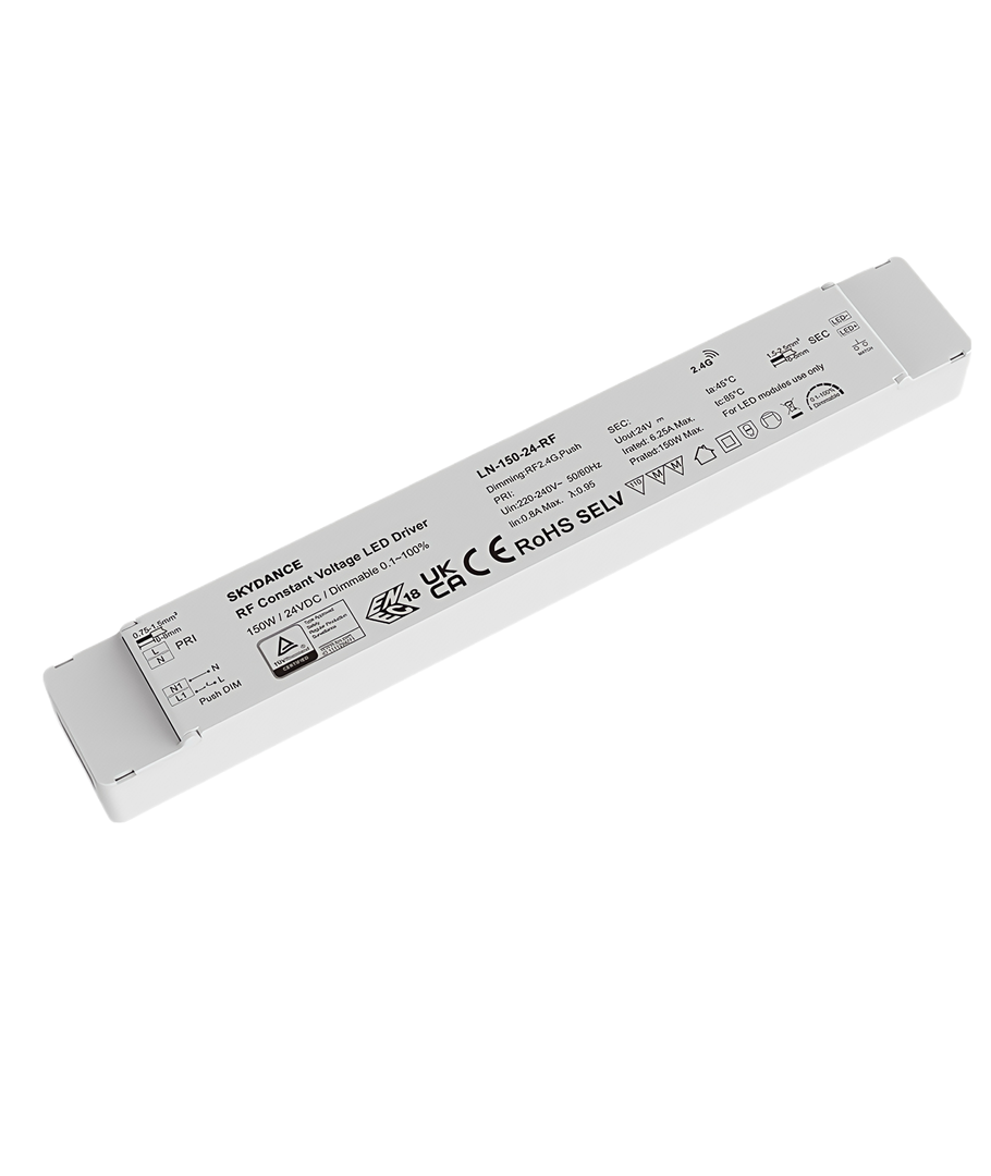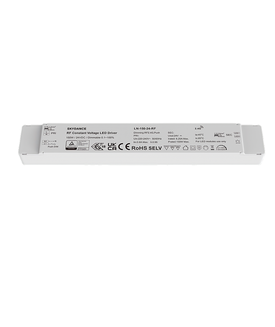 Denna strömförsörjning erbjuder avancerad dimbara funktioner, vilket tillåter justering av belysningsnivåer enligt dina preferenser. Det unika med denna produkt är dess RF kontroll och push-dim teknik, vilket ger dig enkel och bekväm kontroll över ljusstyrkan, oavsett installationens utformning.