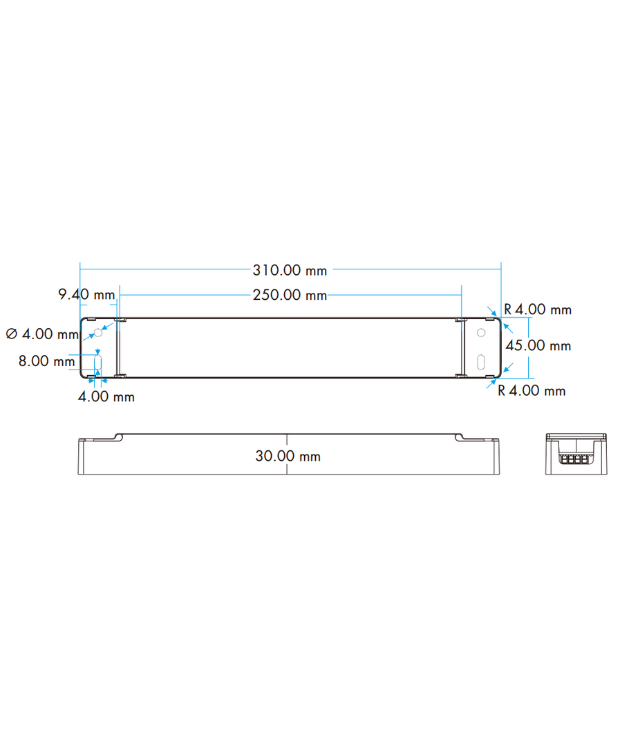 Med sin slanka och kompakta design på 310 x 30 x 45 mm, är denna strömförsörjning lätt att integrera i olika miljöer. Dock bör det noteras att produkten har en IP20-klassning, vilket innebär att den inte är vattentät och bör installeras i torra utrymmen för att undvika skador.