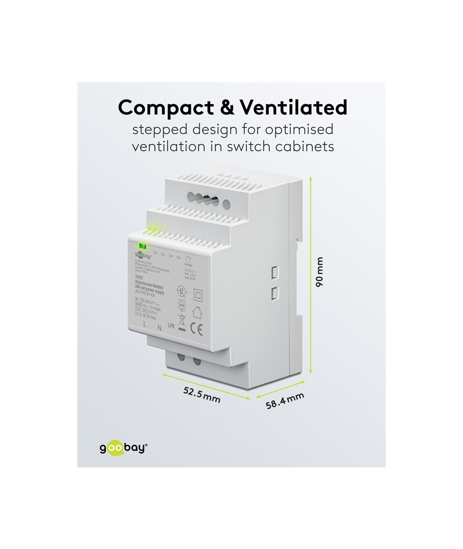 Med måtten 52,5 x 90 x 58,4 mm, är denna strömförsörjning kompakt nog för att enkelt passa in i olika monteringsmiljöer. Den är idealisk för installation på DIN-skenor, vilket sparar plats samtidigt som den levererar kraftfull och konsekvent strömförsörjning.