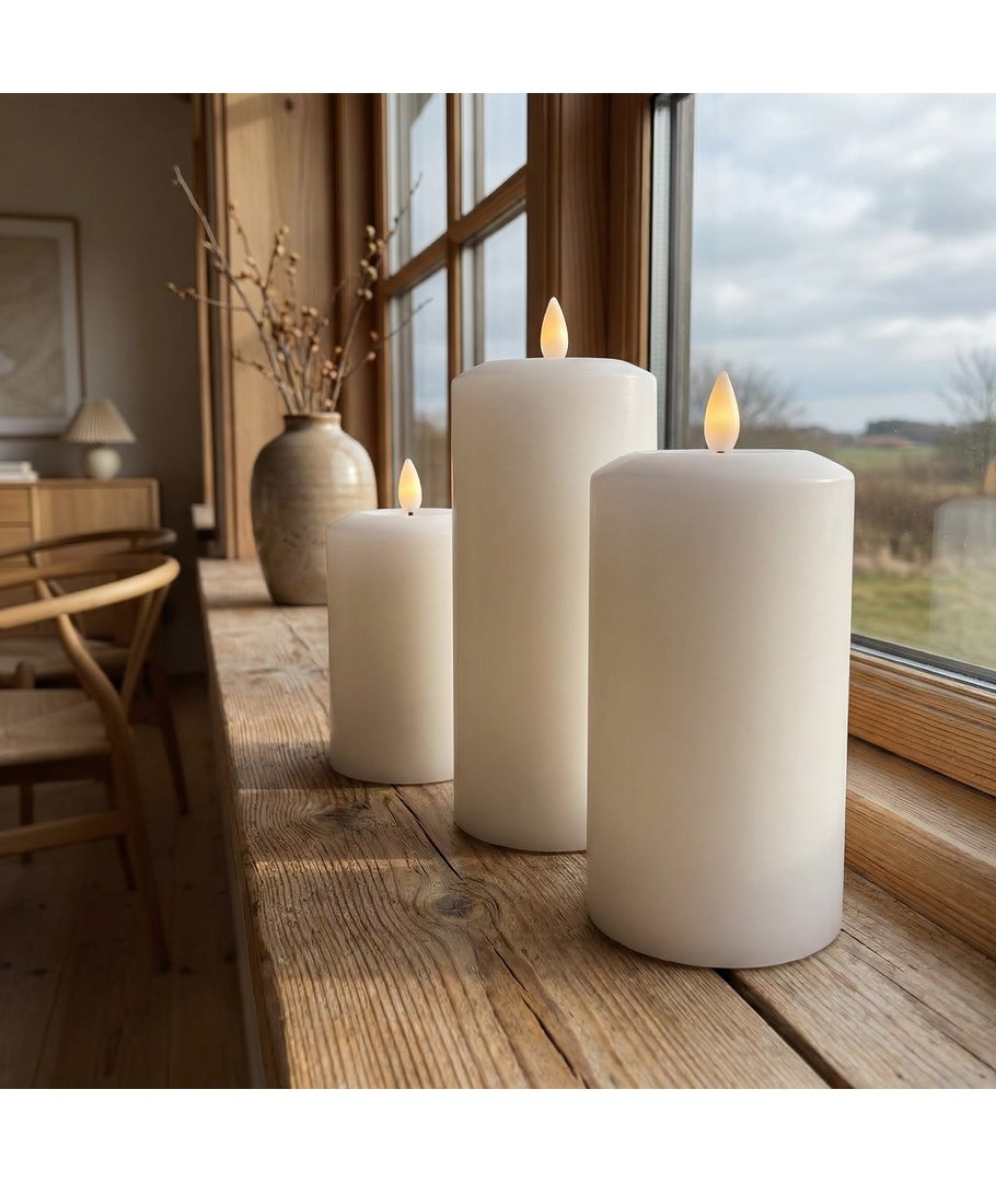 Upplev den mysiga atmosfären från levande ljus utan risk för öppen eld med vårt 3-pack vita LED-ljus med flameffekt. Dessa eleganta blockljus passar perfekt i din inredning och erbjuder en avkopplande belysning i varje rum.