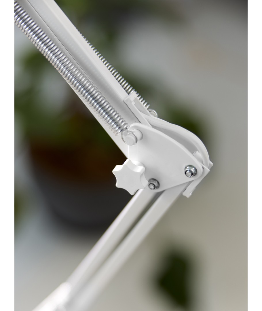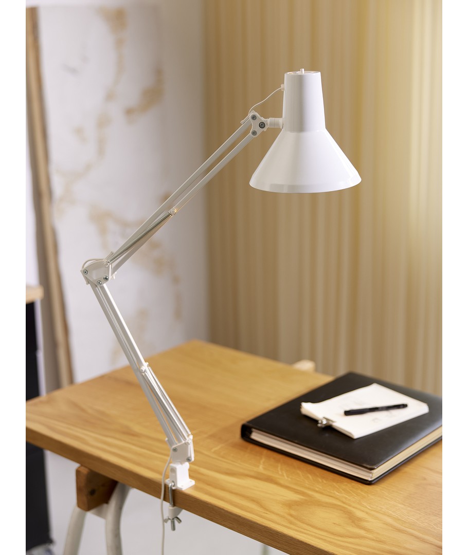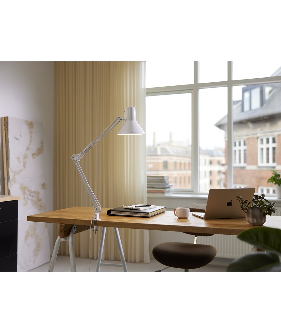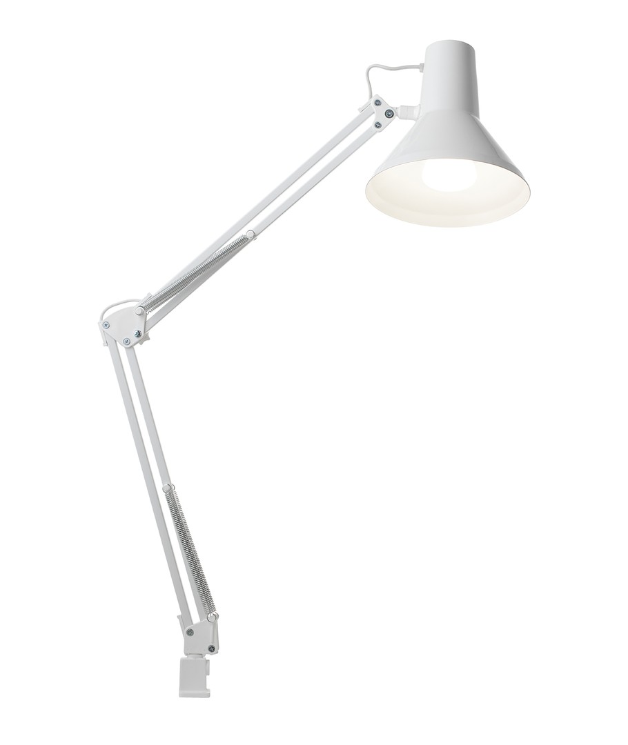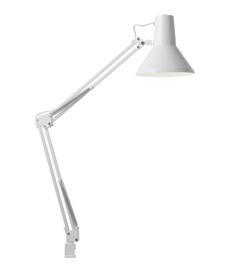Jensen arkitektlampa i vitt från Nielsen Light är den ursprungliga, klassiska arkitektlampan med 4 kraftiga fjädrar och huvud i ett stycke metall. Lampan levereras inklusive bordsklämma och väggfäste, så den är enkel att montera på skrivbordet eller på en vägg.