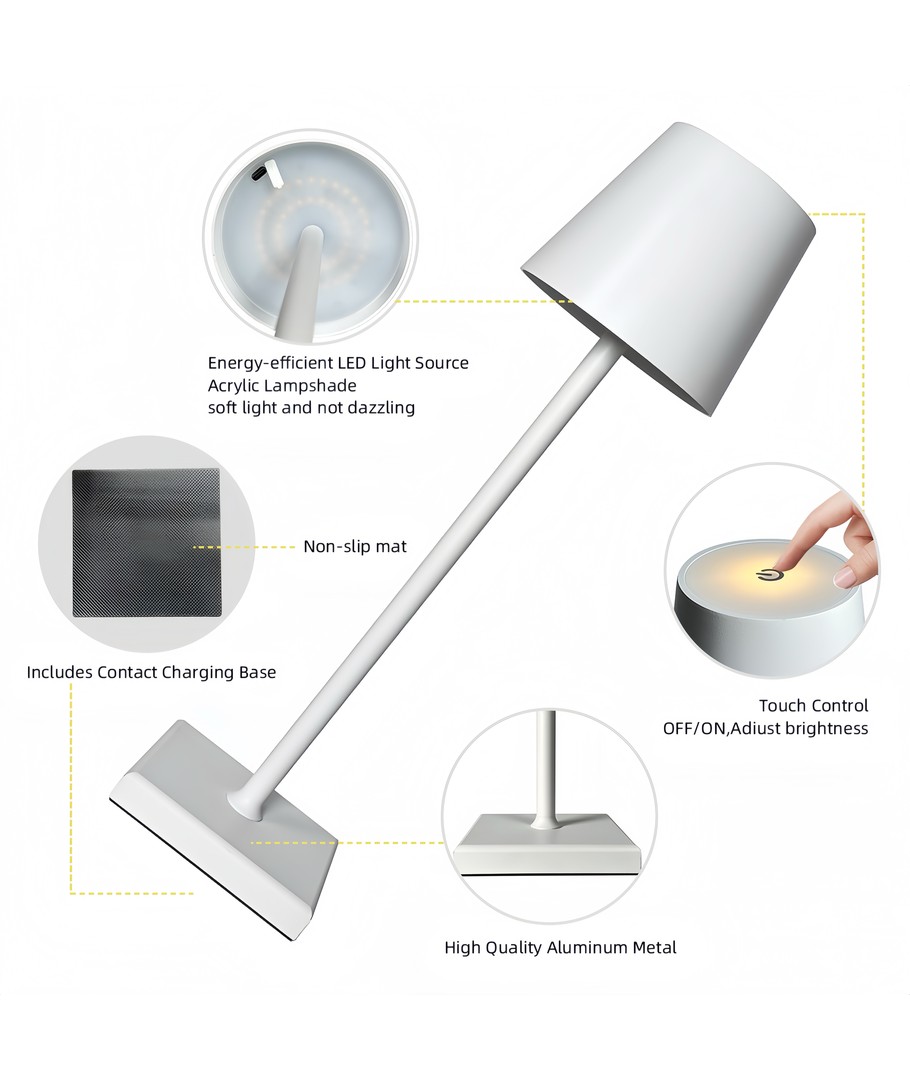 Modern design möter praktisk användbarhet i denna bordslampa, vilket gör den till det perfekta tillägget för både hemmet och trädgården. Med sin touchdimbar funktion kan du enkelt anpassa ljusstyrkan med ett enkelt tryck, och den trådlösa laddningsfunktionen gör att du kan hålla dina enheter laddade utan krångel med sladdar.