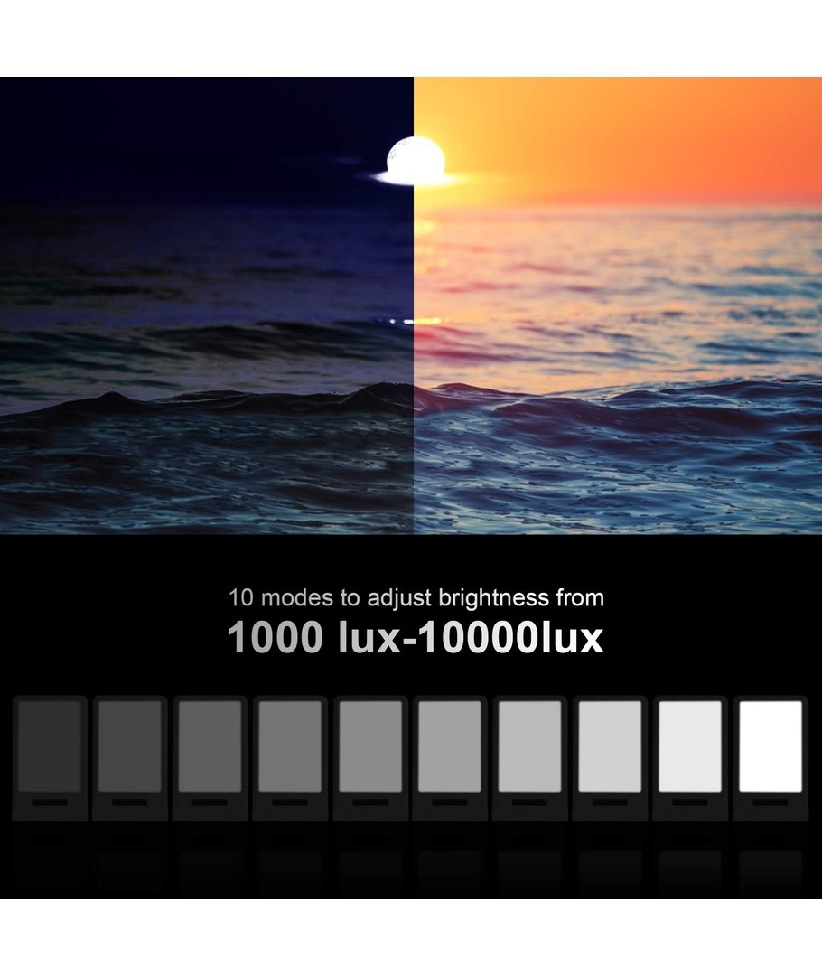 Med dimensioner på 175 x 285 x 30 mm är denna armatur både kompakt och lätt, vilket gör den enkel att placera var som helst i hemmet eller ta med vid behov. Trots sin lilla storlek, ger den upp till 10.000 LUX, som motsvarar dagsljus och är perfekt för att förbättra humöret och koncentrationen.