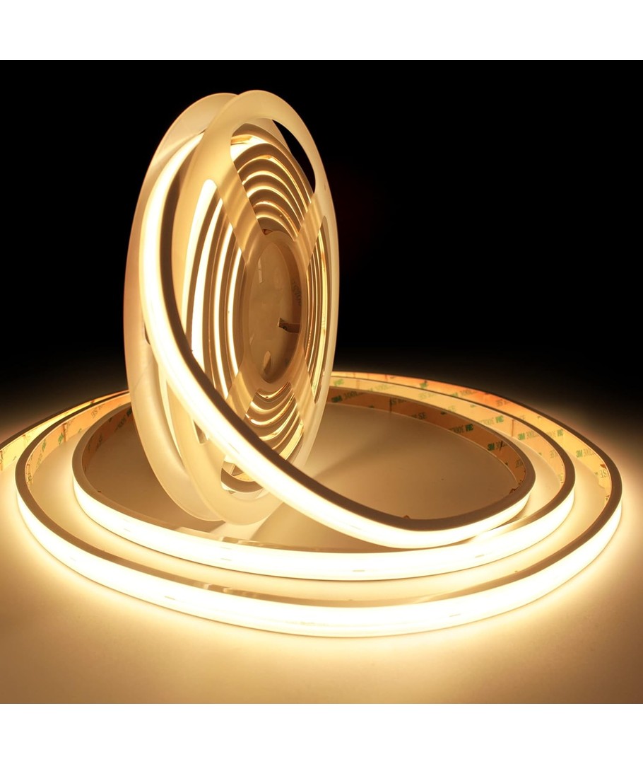 Upplev det perfekta ljuset med en 5m COB-LED strip som erbjuder den senaste tekniken inom LED-belysning. Denna strip avger ett fantastiskt varmvitt ljus på 3000K, vilket ger ett avkopplande sken och hjälper till att skapa en trevlig atmosfär.