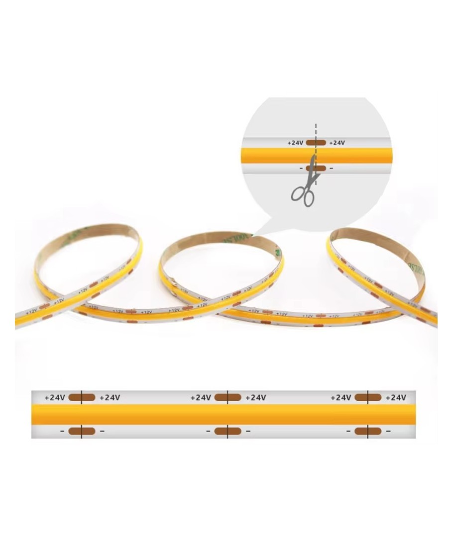 Flexibilitet och mångsidighet:Den eleganta och diskreta designen av stripen gör att den smidigt kan integreras i olika miljöer och dekorstilar. Den långvariga COB-LED-teknologin säkerställer hållbar och pålitlig användning över tid.
