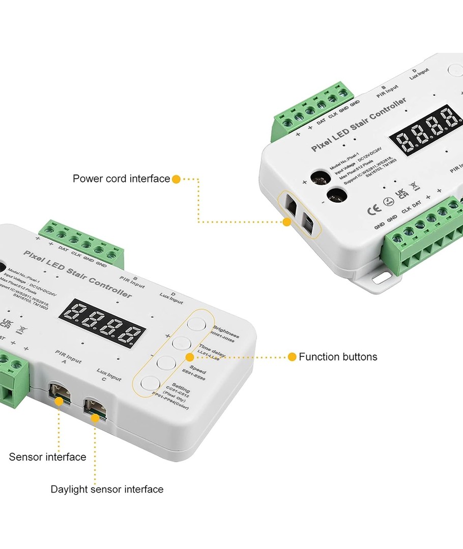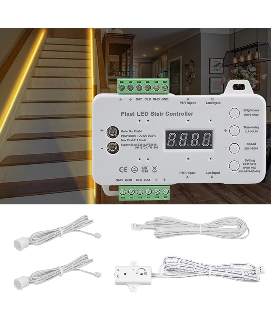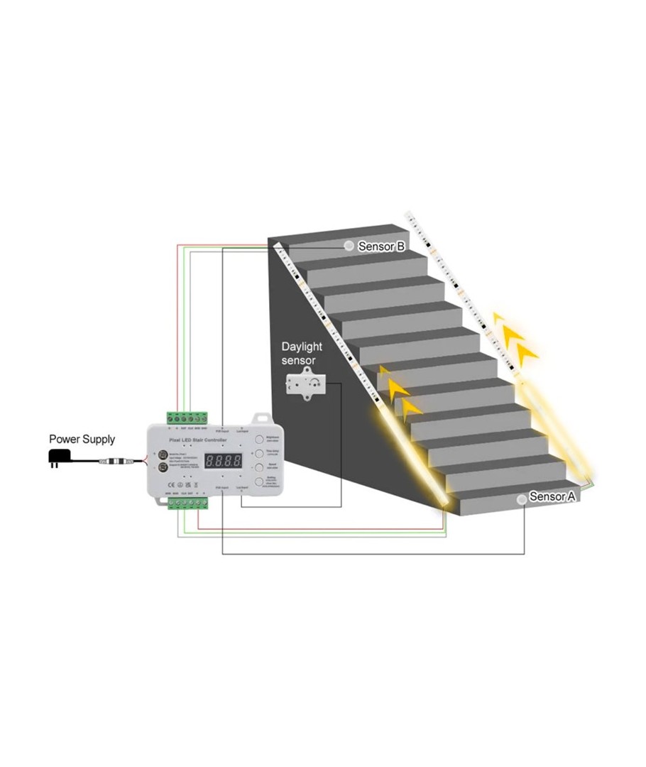 Denna intelligenta kontrollcentral ger dig full kontroll över din trappbelysning. Anpassa belysningsmönster och ljusstyrka med lätthet.