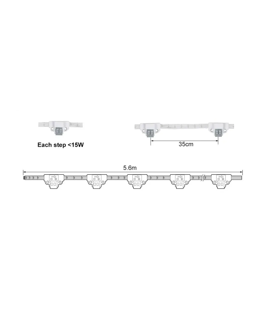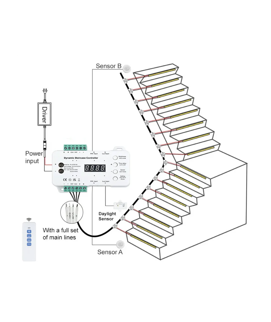 Enkel montering där en "master" ledning dras på ena sidan av trappan, där ljuset till varje steg enkelt ansluts. Därefter kan ljuset på varje steg styras separat med kontrollenheten.