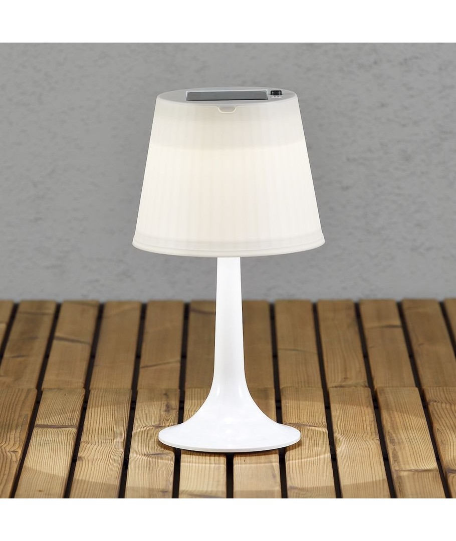 Assisi LED bordslampa har inbyggt batteri som laddas via solcellerna på toppen av lampskärmen, där strömbrytaren också är placerad. Den är utförd i vit plast och ser ut som en traditionell inomhusbordslampa med retro-referenser.