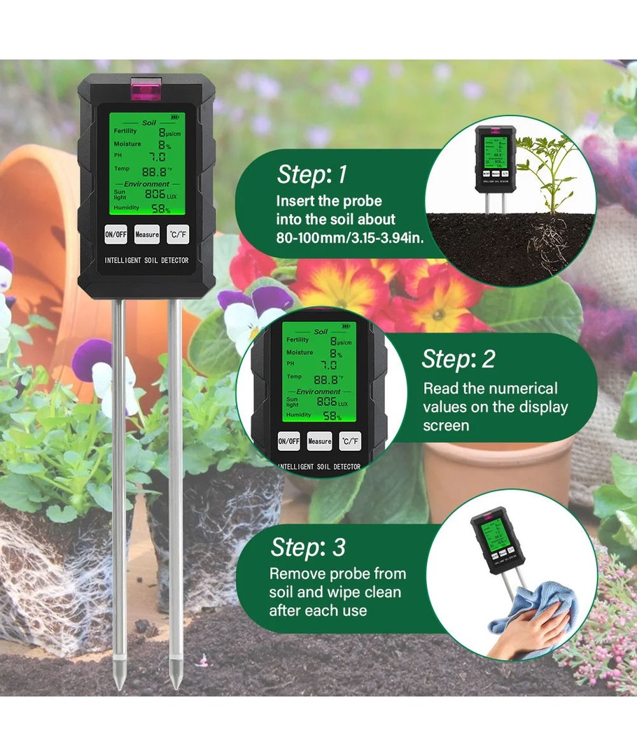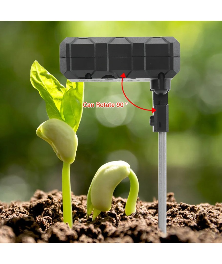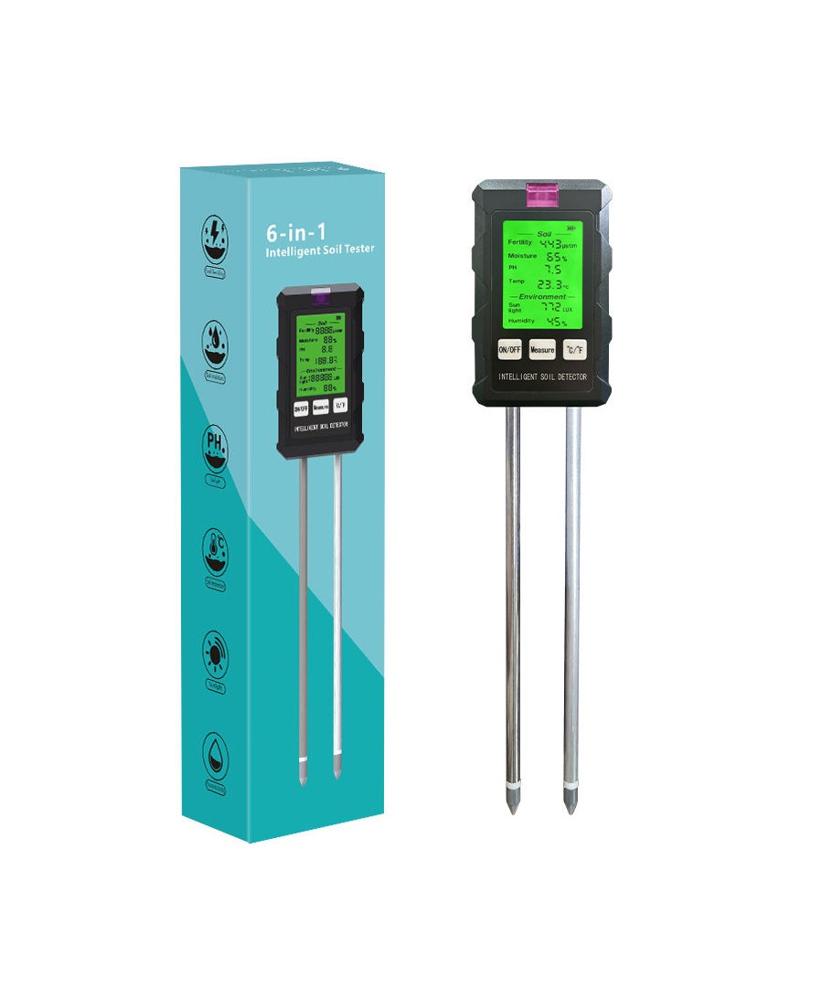 Upplev precision och mångsidighet med vår 6 i 1-mätare, som förenklar vården av dina växter genom att mäta pH, fukt, temperatur, ljusintensitet, näringsinnehåll i jorden samt luftfuktighet i en kompakt enhet.