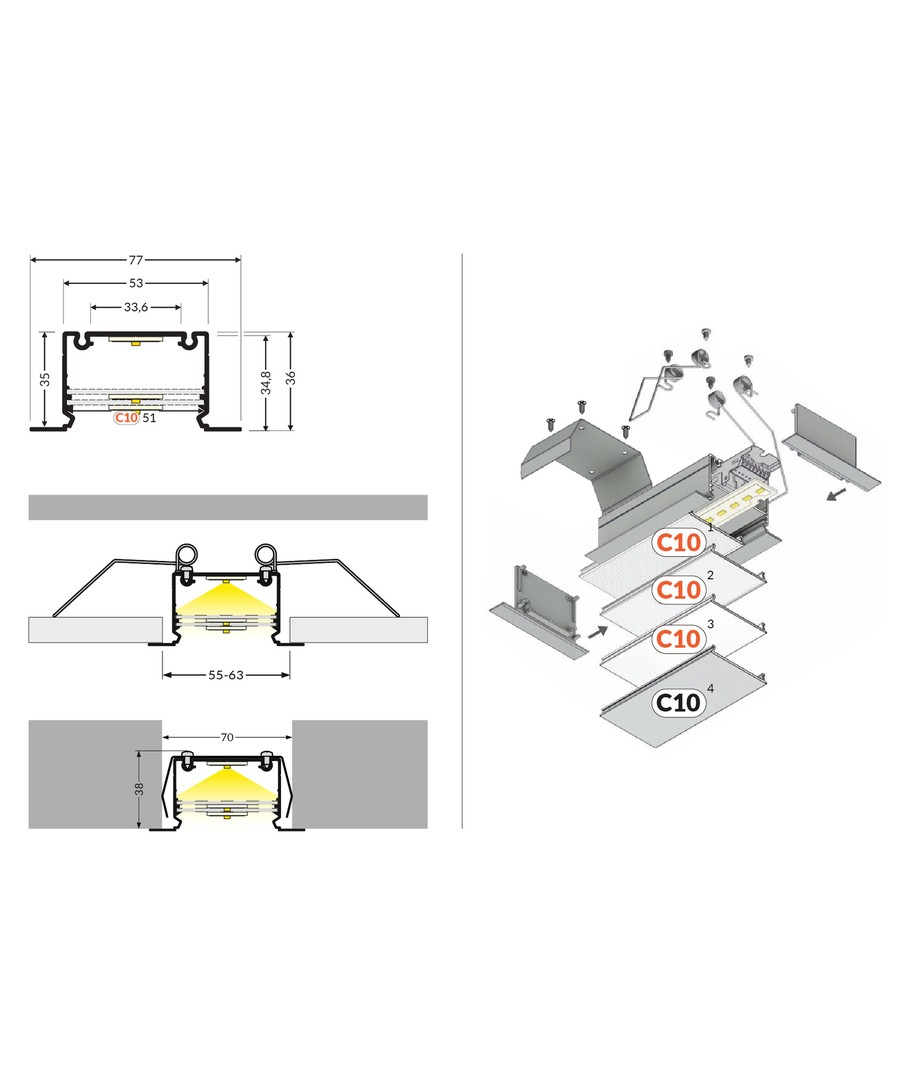 Anodiserad, infälld, LED skena
