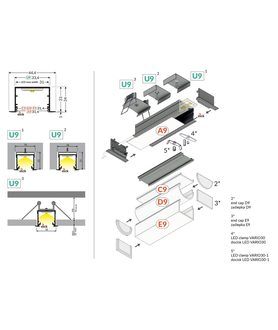 1m aluprofil VARIO30-07 ACDE-9/U9 är en vitlackerad infälld LED-skena designad för mångsidig LED-belysning.