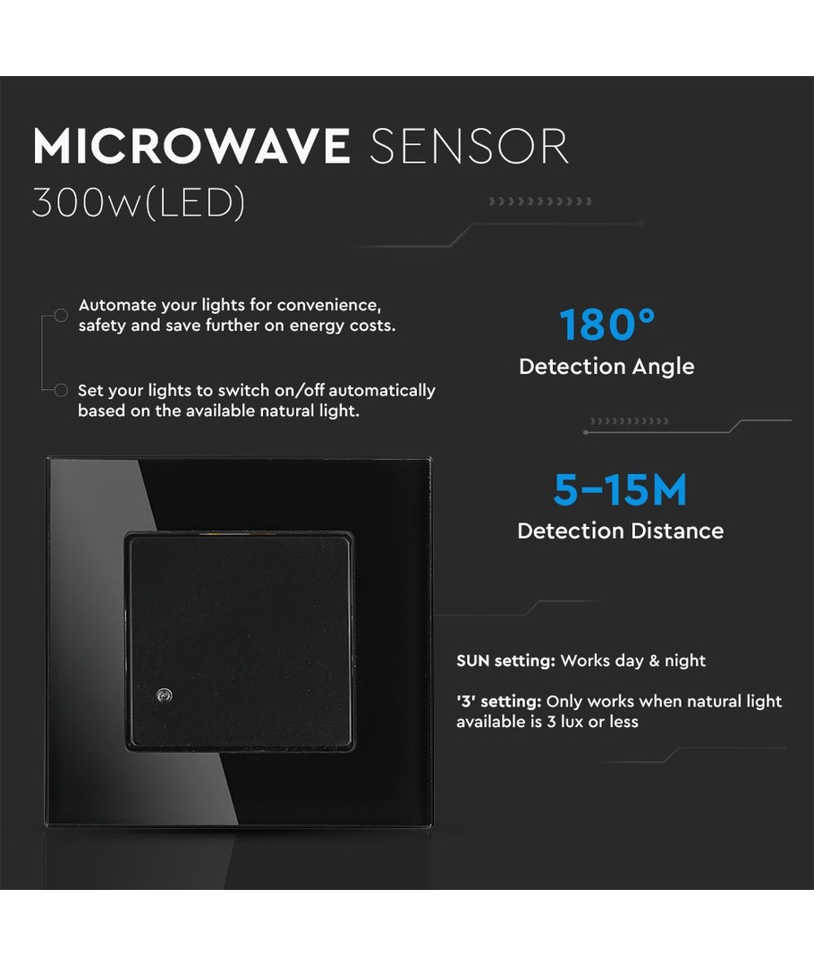 Den väggmonterade mikrovågssensorn är den perfekta lösningen för automatisk ljusstyrning i ditt hem eller kontor, vilket gör det enkelt att optimera energiförbrukningen och komforten.