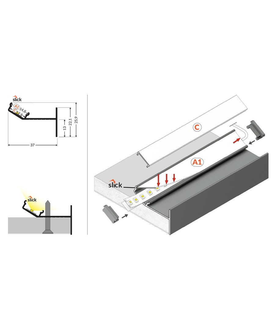 Anodiserad, infälld, LED-skena
