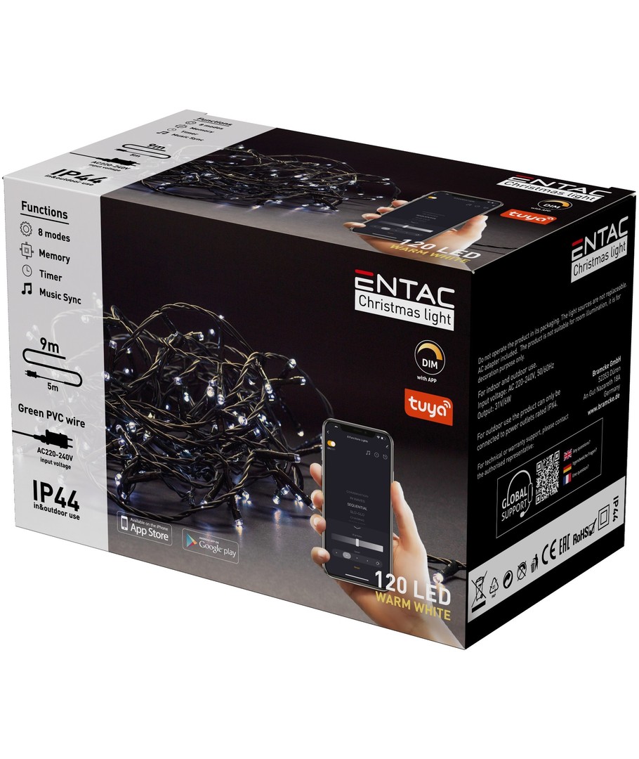 9 meters Smart Home LED-juleljusslinga med 120 lysdioder i varmvitt för utomhusbruk.