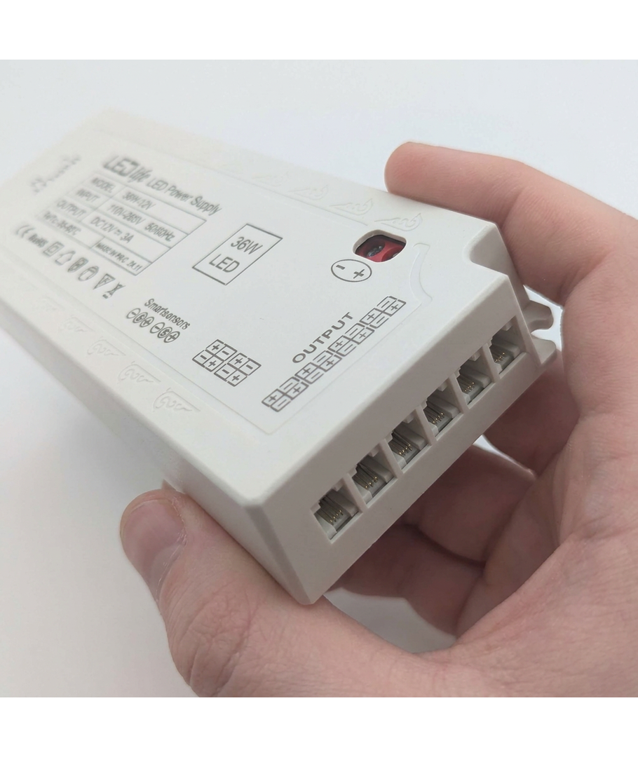 Med en kapacitet på 36W kan denna driver enkelt hantera upp till 6 av dina favorit möbelspots, vilket ger dig frihet att skapa den perfekta belysningslösningen utan bekymmer. Dess ultra-slimmade design (endast 16 mm hög) gör den otroligt enkel att gömma undan bakom möbler, i skåpsocklar eller andra trånga utrymmen, så att fokus förblir på ljuset - inte på tekniken. Installationen är plug-and-play med standard DuPont-kontakter, vilket innebär att du snabbt och enkelt kan ansluta dina spots och njuta av ett flimmerfritt och stabilt ljus.