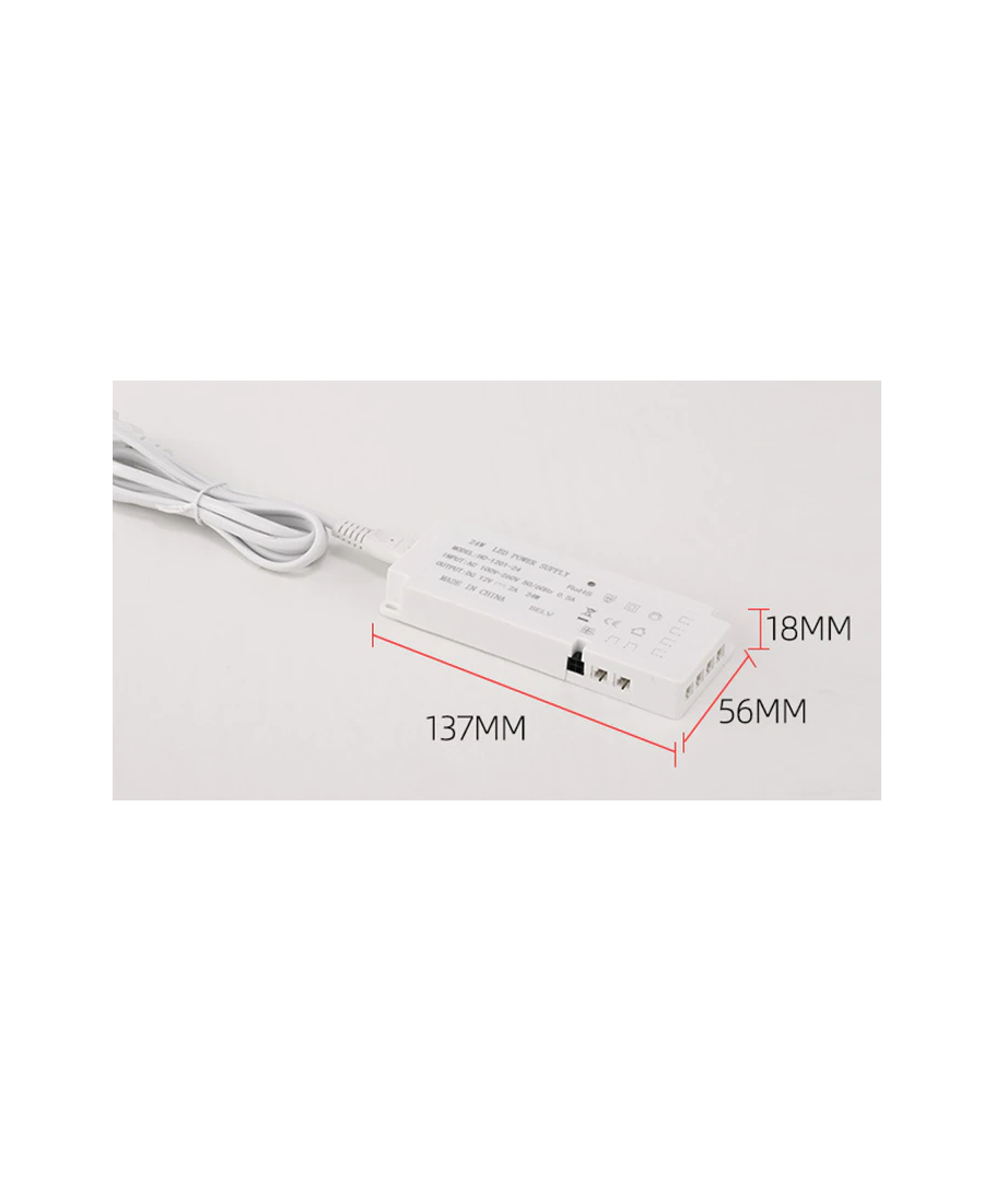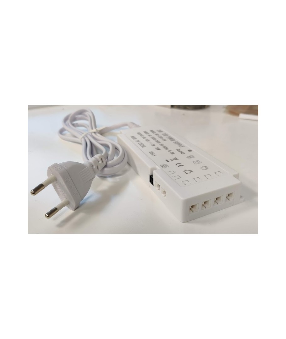 Strömförsörjningen är kompakt och enkelt att montera, vilket gör den idealisk för användning inuti möbler eller på trånga platser. Med måtten 55 x 18 x 138 mm är den diskret men kraftfull och kan hantera upp till 6 spotlights samtidigt.