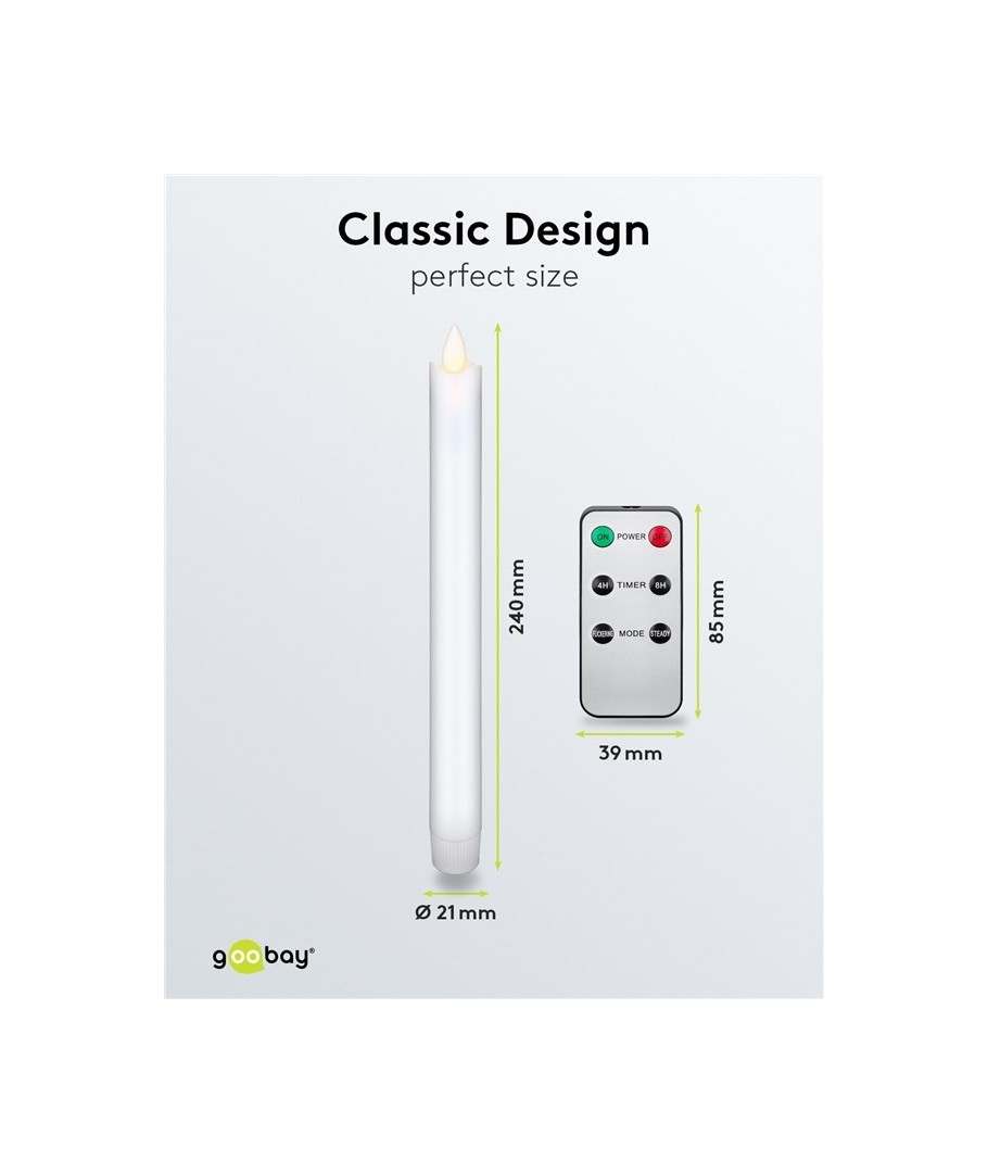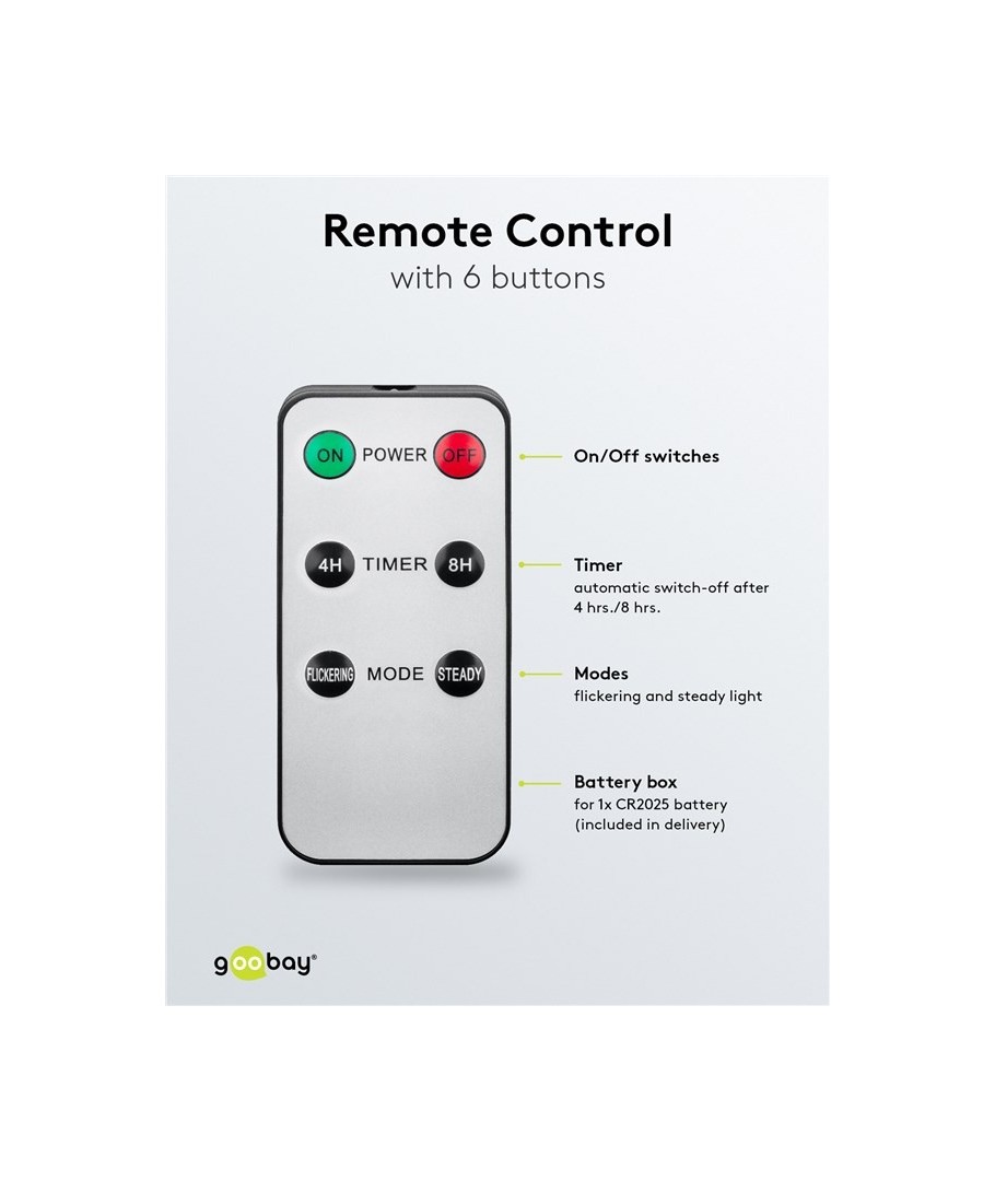 Med den medföljande 6-knapps fjärrkontrollen har du full kontroll över stearinljusen. Tänd och släck dem enkelt eller ställ in en timer på 4 eller 8 timmar för att spara energi. Du kan även välja mellan en flimrande eller konstant ljusinställning, beroende på din stämning.