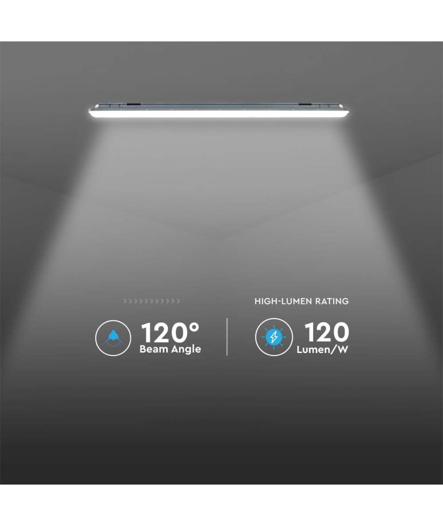 Armaturen har inskruvning för kabelgenomföring i bägge ändar, för enkel seriekoppling. Med en IP65-klassning är du garanterad en robust armatur som är både vatten- och dammtät. Armaturen är energivänlig med en låg förbrukning som levererar hela 120lm/W.