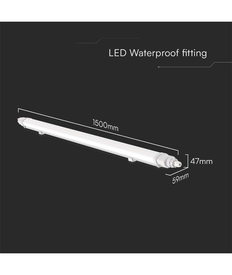Med sin IP65-klassning är denna armatur perfekt anpassad för att användas utomhus, och klarar av både vattenstänk och regn. Dess dimensioner på 59 x 1500 x 47 mm gör den till en smal och diskret lösning, samtidigt som den uppfyller kraven för kraftfull belysning.