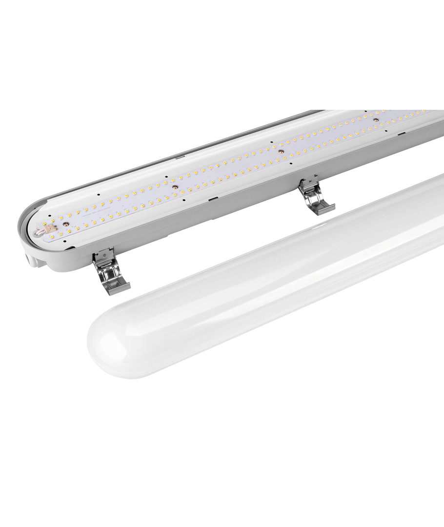 Armaturen levererar ett behagligt, enhetligt ljus med hög färgåtergivning (RA90), vilket säkerställer korrekt färguppfattning och en visuellt bekväm arbetsmiljö. Med IP65 är armaturen idealisk för både industri, verkstäder, produktionshallar, parkeringsanläggningar och områden med damm, fukt och smuts.