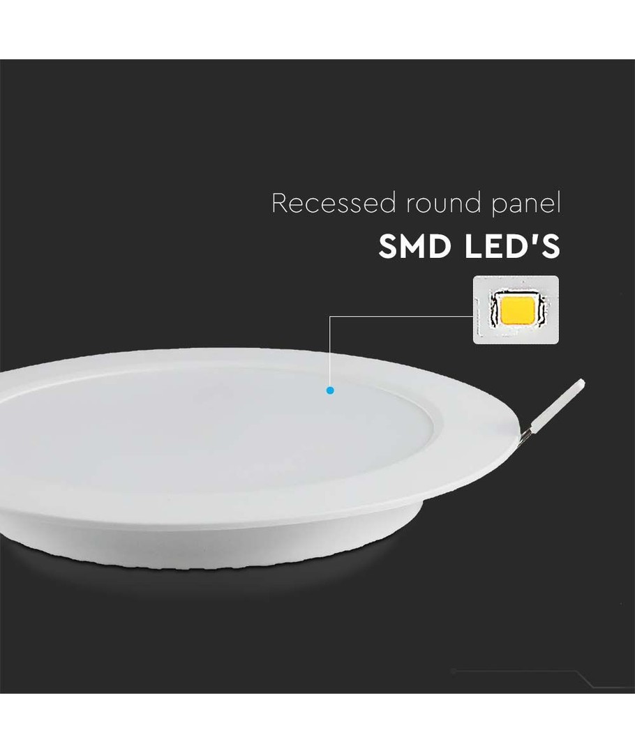 Panelens dimensioner är 28,9 x Ø220,8 mm, med en rekommenderad hålstorlek på 205 mm för infällnad. Notera att produkten har en IP20-klassificering, vilket innebär att den inte är vattentät och bör användas i torra miljöer. Levereras med integrerad ljuskälla för enkel installation.