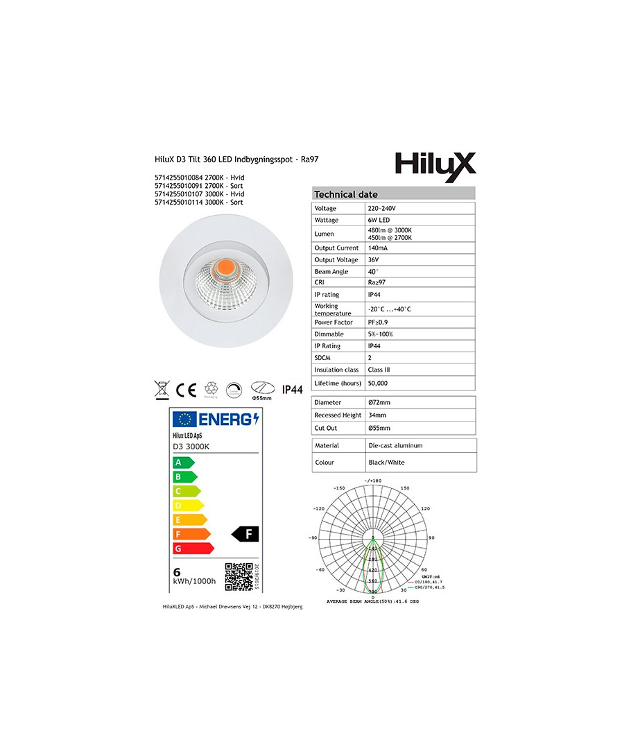 Med ett fokuserat ljus på 40 grader och en ljusstyrka på 480 lm, säkerställer denna downlight ett kontrollerat ljusflöde som framhäver varje detalj.
