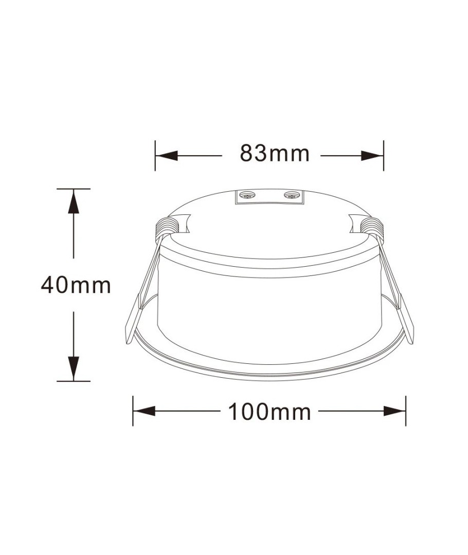 Lampans dimensioner är 40 x Ø100 mm, och den kräver ett hål på 83 mm i taket. Med en IP44-klassificering är den även redo att stå emot fukt och vattenstänk på framsidan, vilket gör den idealisk för användning i både kök och badrum.