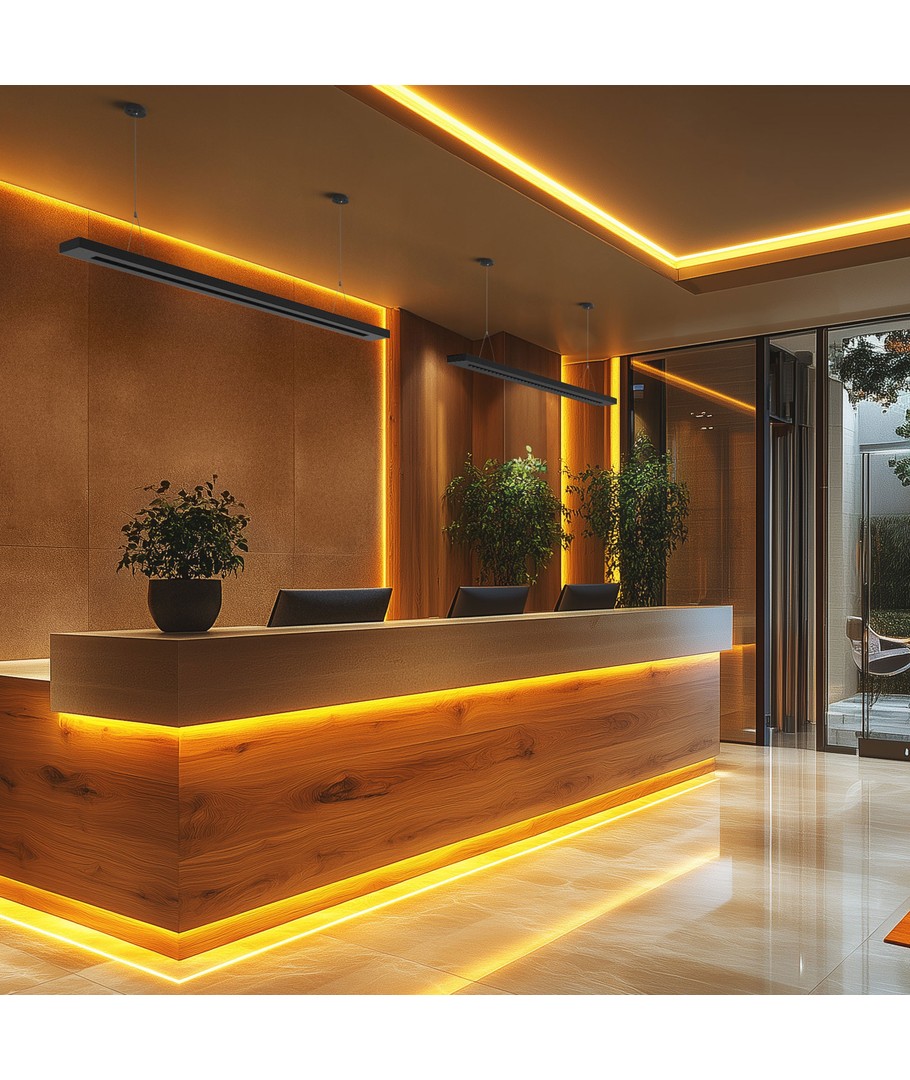Denna stilrena kontorsarmatur erbjuder en energieffektiv och högpresterande belysningslösning för moderna arbetsmiljöer. Med sin diskreta svarta design och kompakta dimensioner, 1195 x 25 x 100 mm, smälter den enkelt in i olika inredningsstilar.