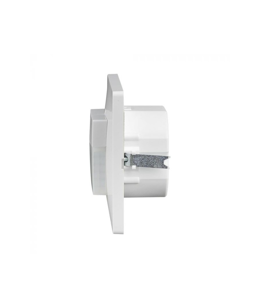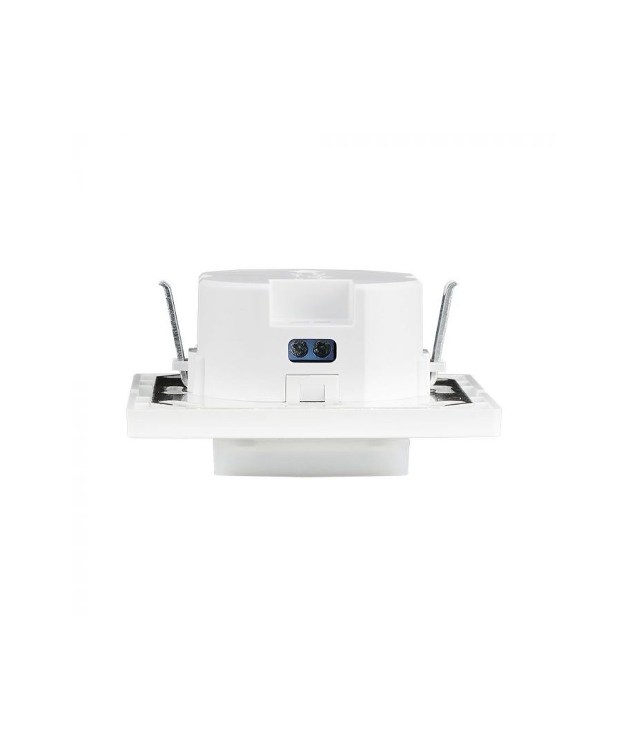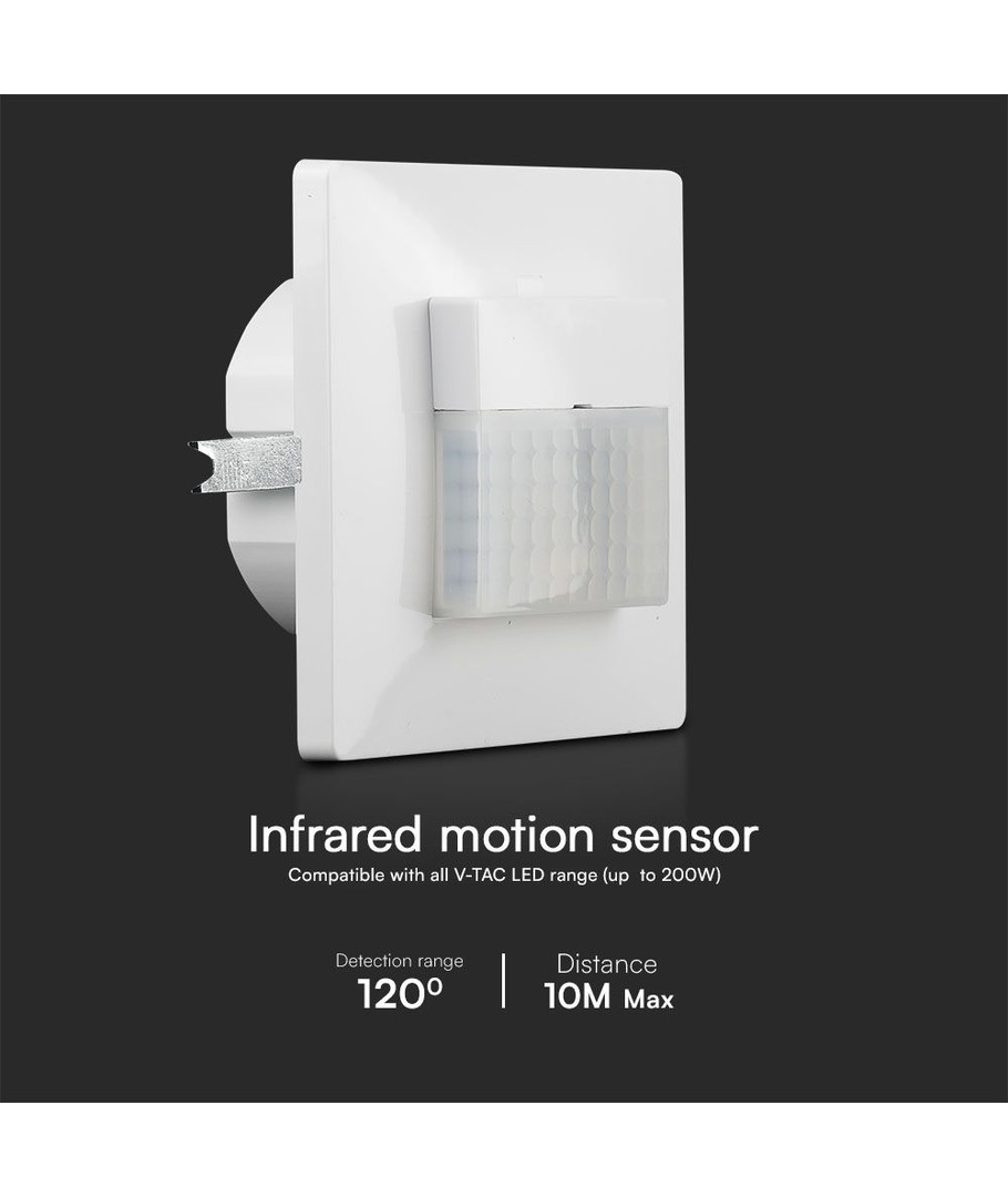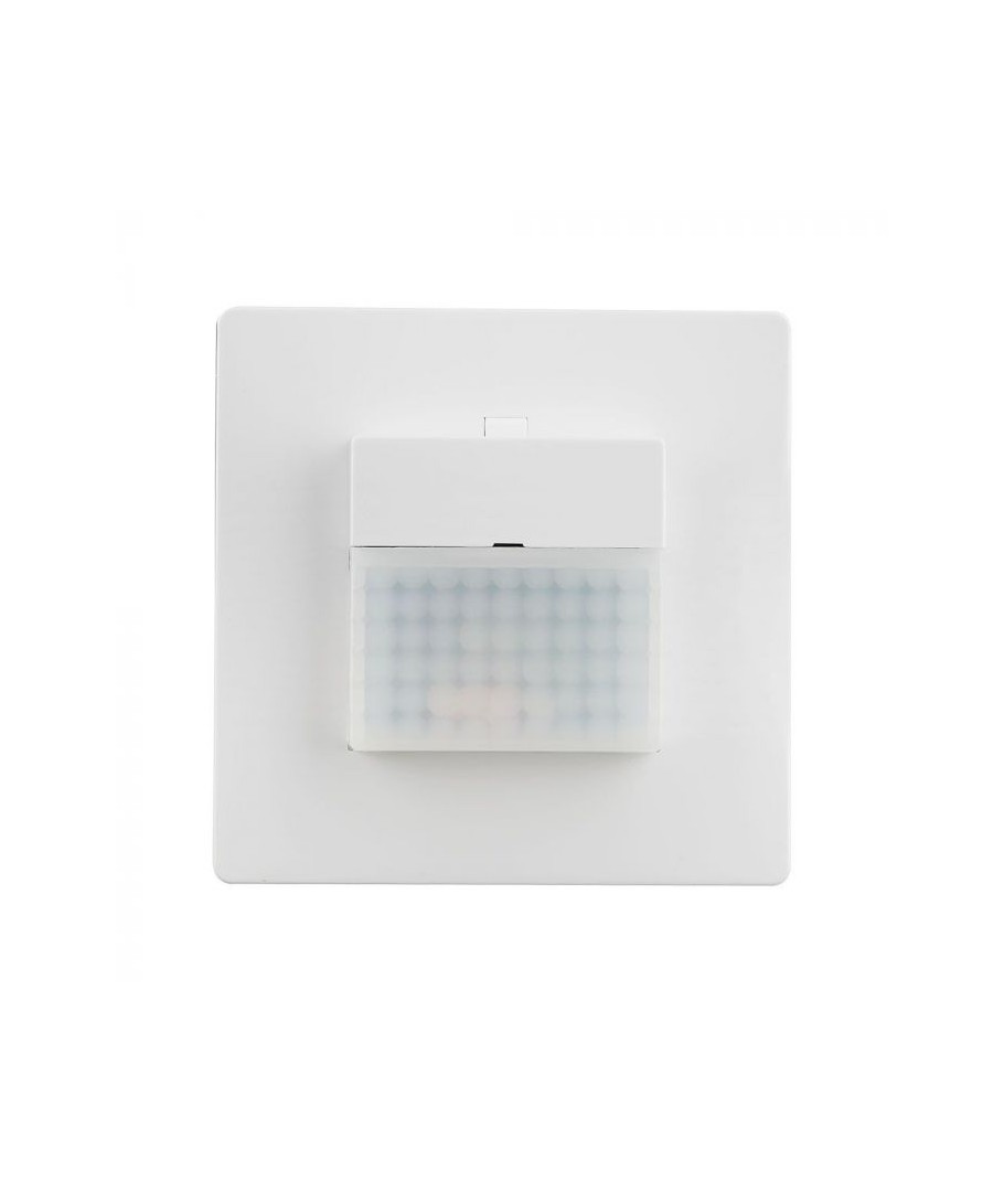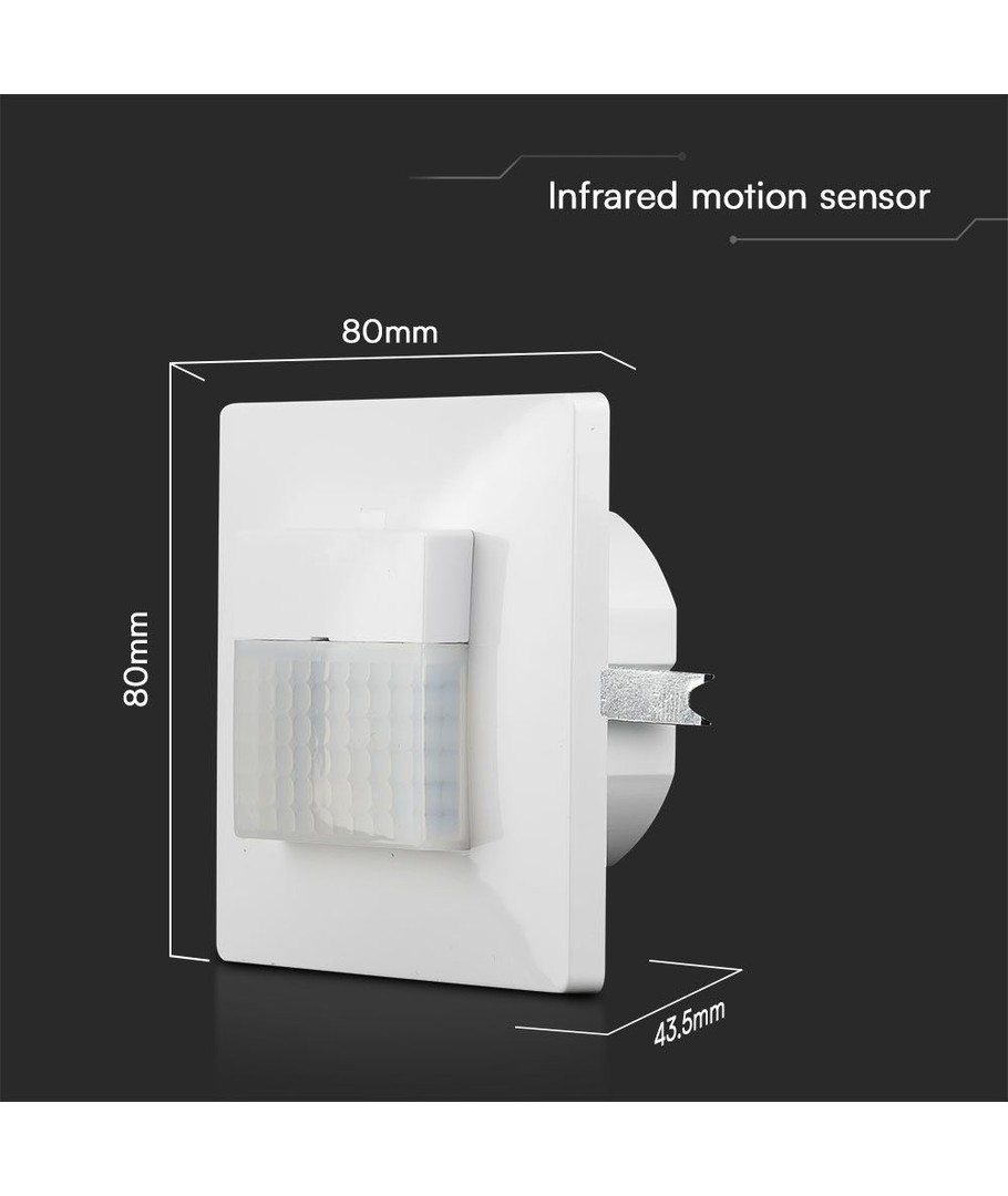 Den väggmonterade rörelsesdetektorn i vitt är designad för inbyggnad och erbjuder exakt rörelsedetektering med infraröd PIR-teknologi, vilket gör den idealisk för automatisering i hemmet eller kommersiella lokaler.