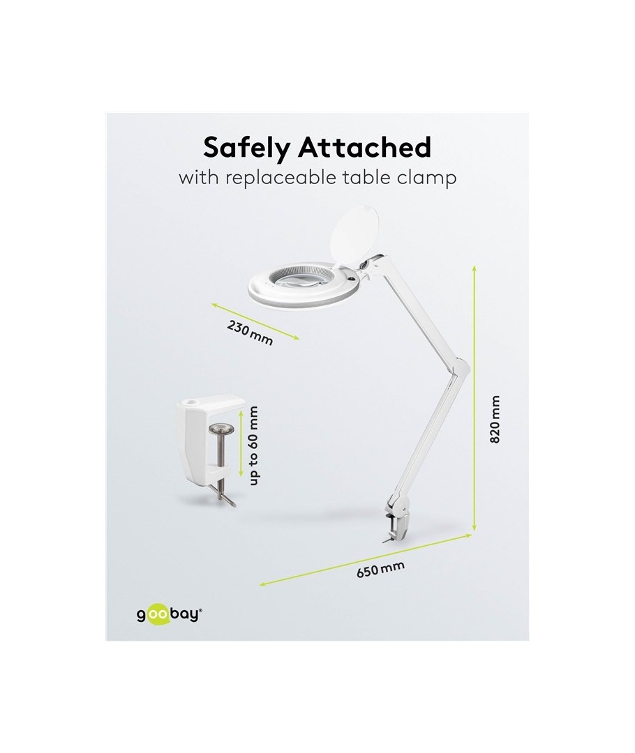 Den kompakta och flexibla designen av denna förstoringslampa gör den enkel att integrera i olika arbetsytor. Dess dimensioner på 820 x Ø230 mm innebär att den har både ett tillräckligt stort synfält och en praktisk storlek för begränsade utrymmen. Med klämfästet kan du enkelt fästa lampan på bord och arbetsytor, vilket ökar dess användbarhet ytterligare.