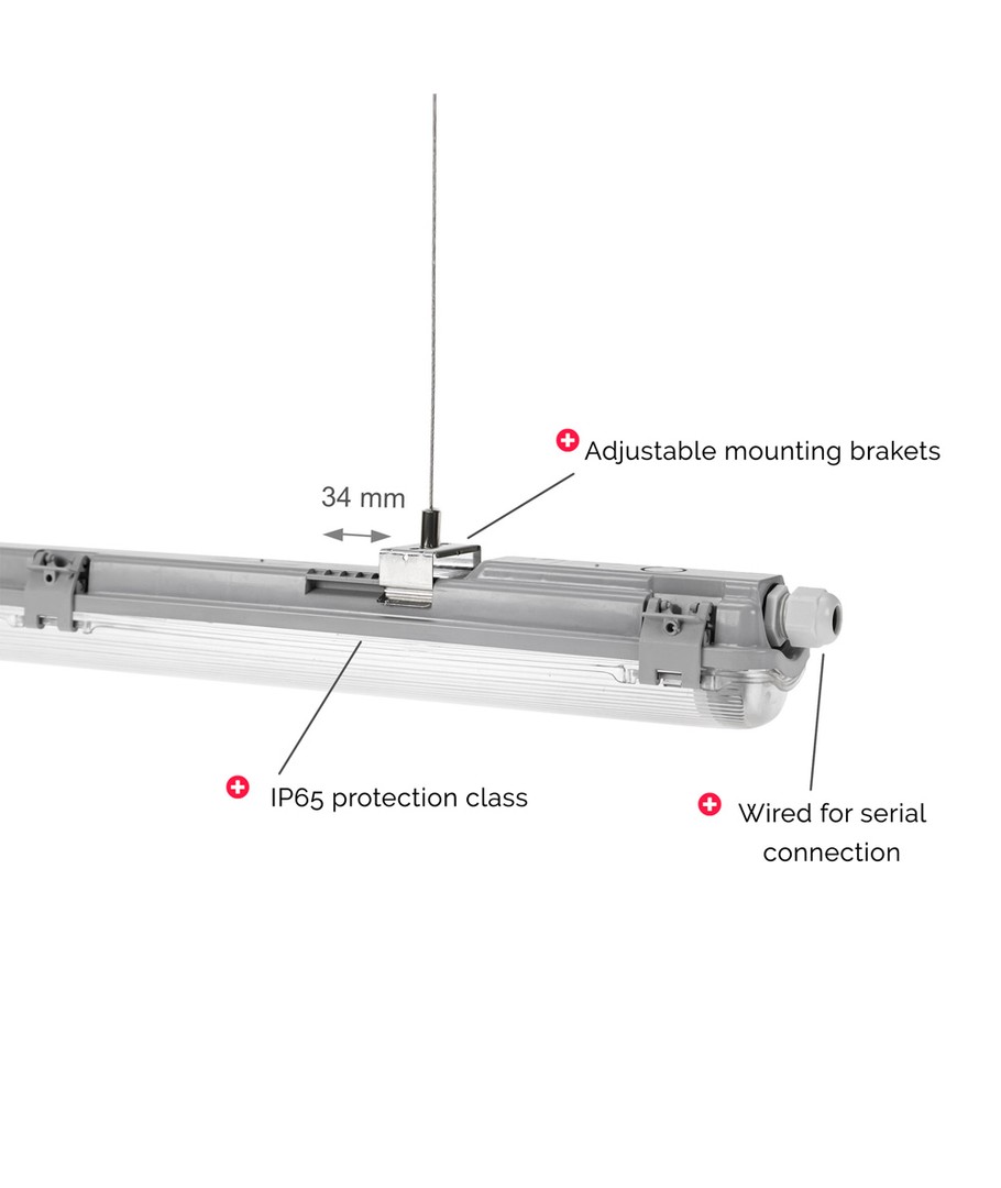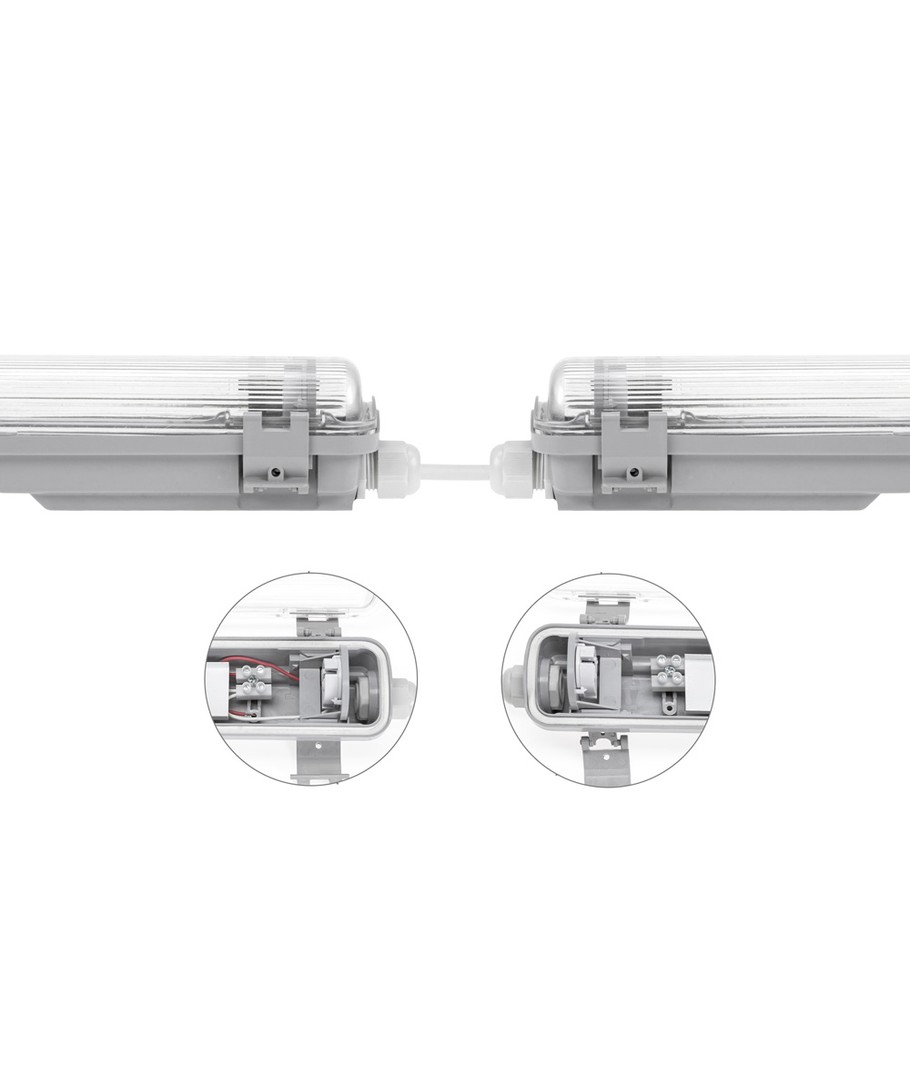 LED-armaturen är designad för att passa 2x 120cm LED-lysrör, vilket gör den idealisk för större utrymmen där stark och jämn belysning krävs. Den smarta konstruktionen med genomkoppling gör installationen enkel och smidig.