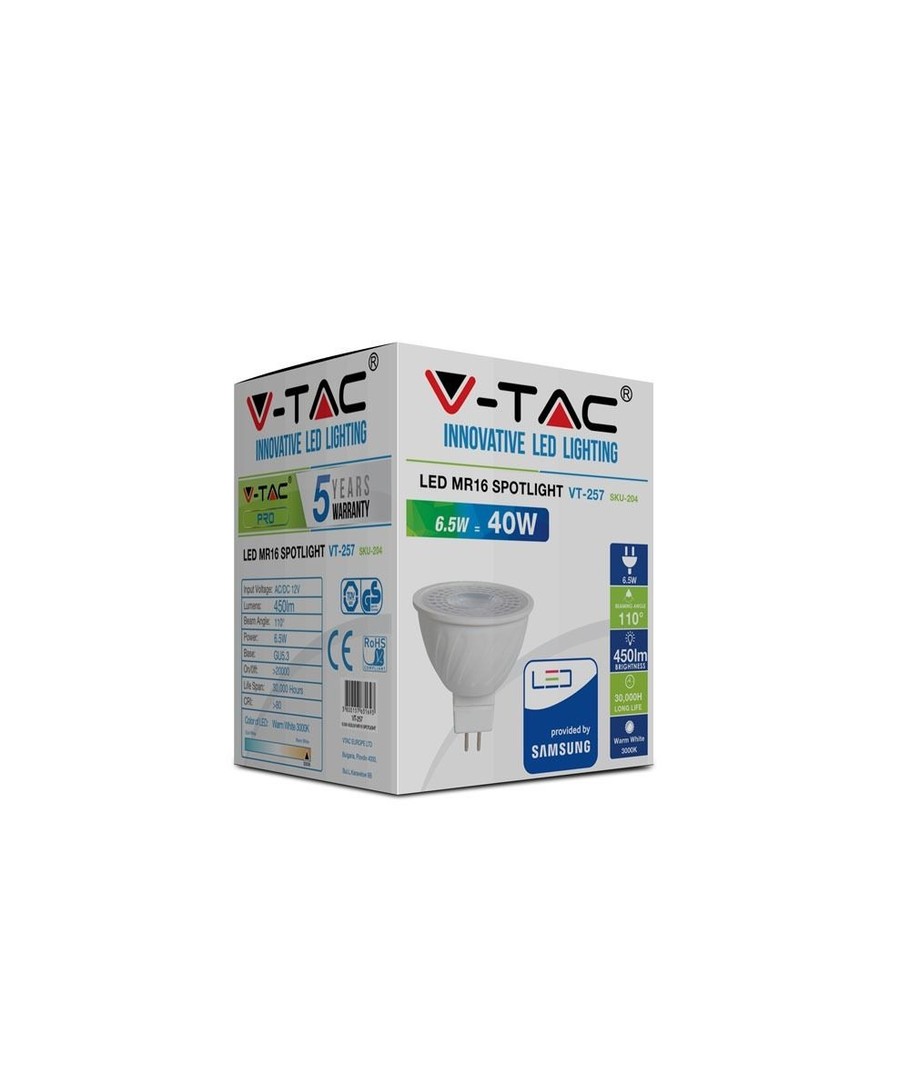 Denna GU5.3 6,5W LED spotlampa är designad för att vara en effektiv och miljövänlig belysningslösning. Med en MR16 / GU5.3 sockel och strömförsörjning på 12V DC, ersätter den glödlampor på 55W, vilket gör den till ett utmärkt alternativ för dem som vill spara energi.