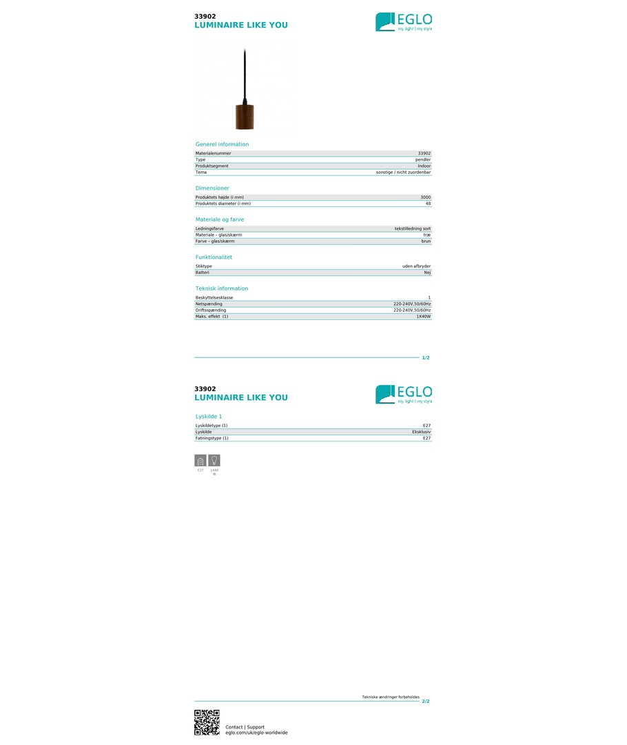 EGLO UPPHÄNG E27 med 3 meter textilsladd i nöt. Levereras exkl. ljuskälla