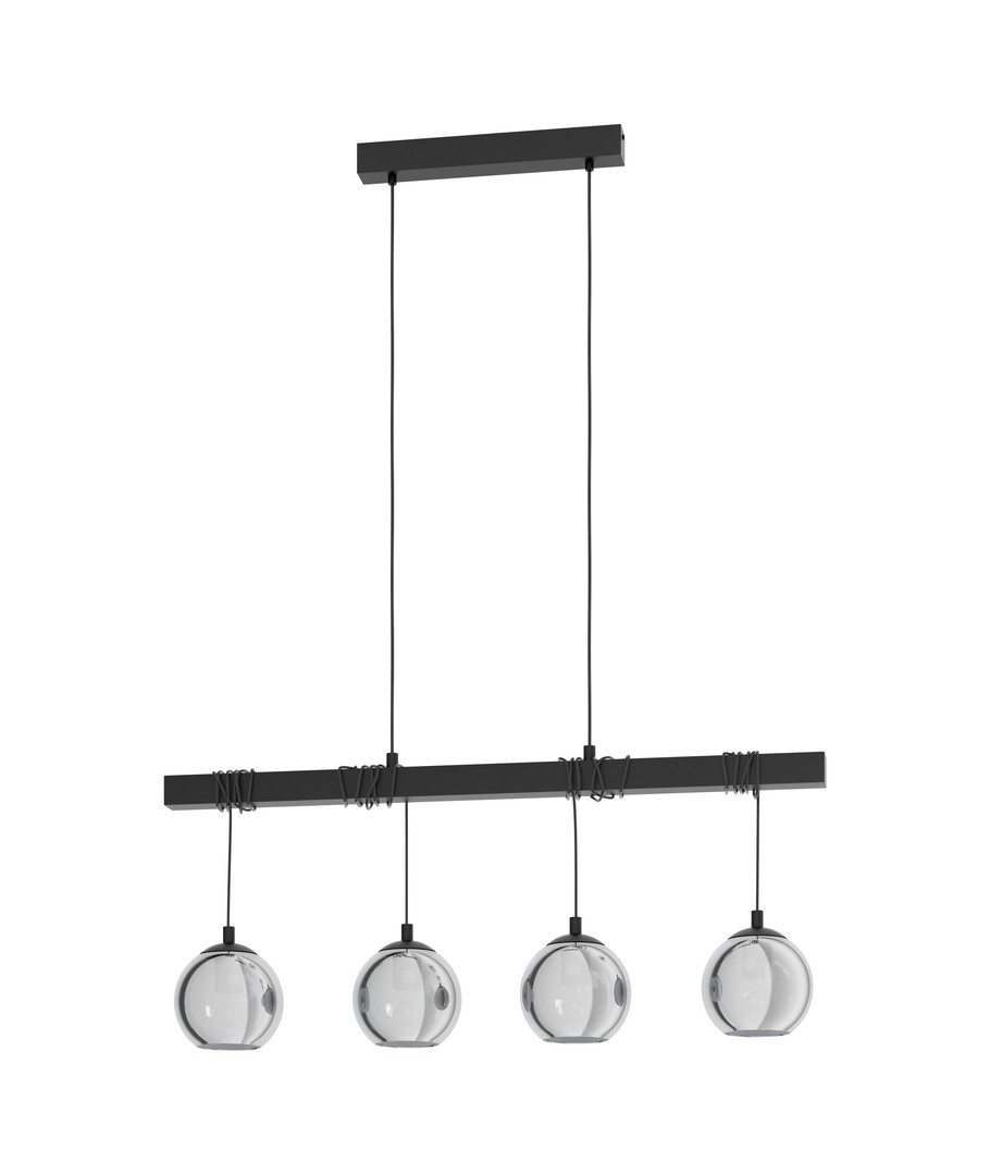 Argallo har 4 E27 socklar omgivna av var sin rund skärm i rökfärgat glas.