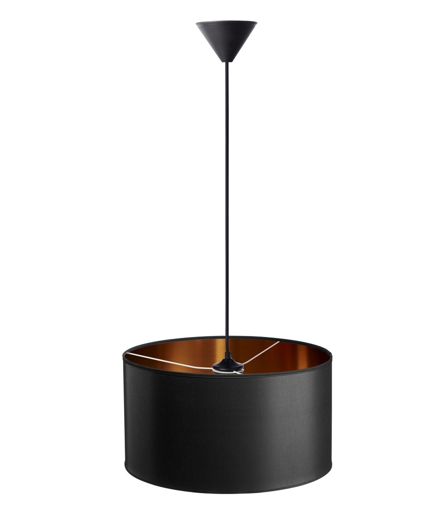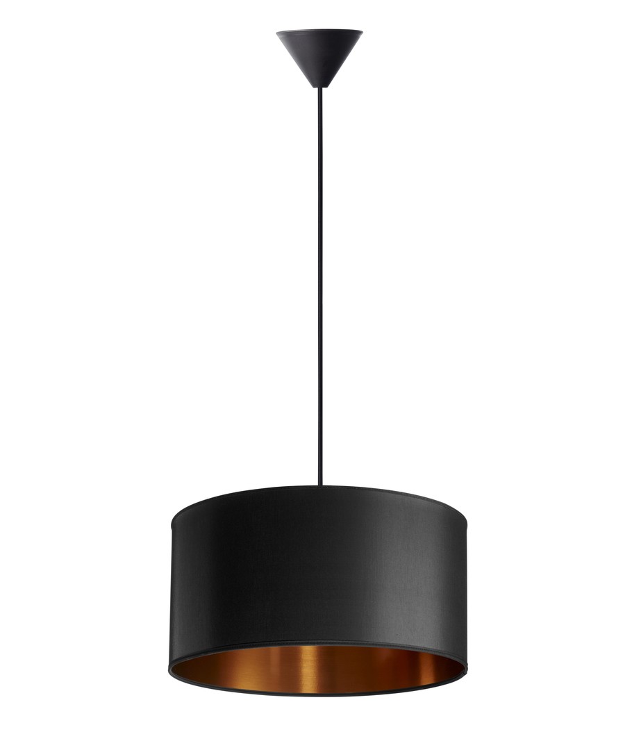 Lätt och elegant pendellampa från danska Nielsen Light, som är kopparfärgad på insidan och klädd med svart tyg på utsidan.