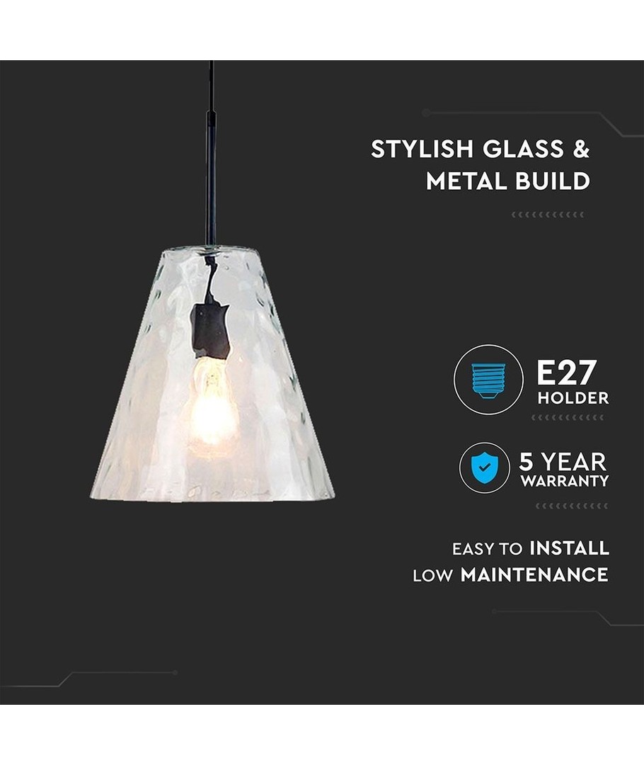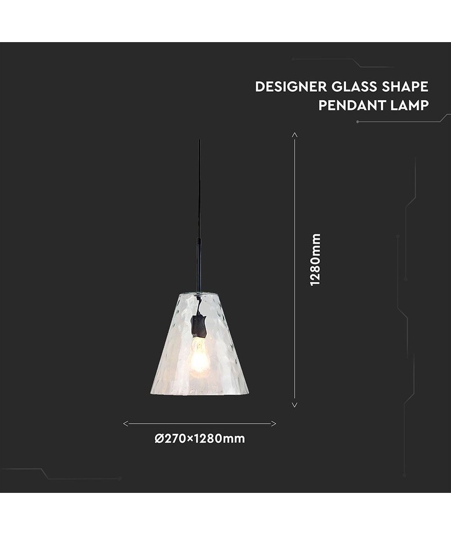 Upptäck en belysningslösning som elegant kombinerar funktion och stil med V-Tac modern pendellampa i konisk glasdesign. Denna tidlösa pendellampa har en diameter på 27 cm, vilket gör den till en perfekt mittpunkt för vardagsrummet eller matsalen.