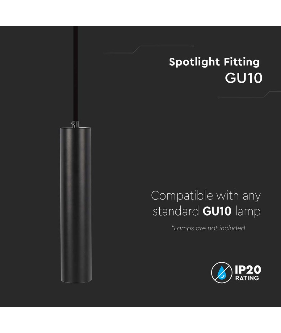 V-Tac GU10 Pendel Ø5,5x30cm - Svart är en stilfull belysningslösning för ditt hem eller kontor, som ger dig möjlighet att anpassa ditt ljusval med en lämplig GU10 ljuskälla.