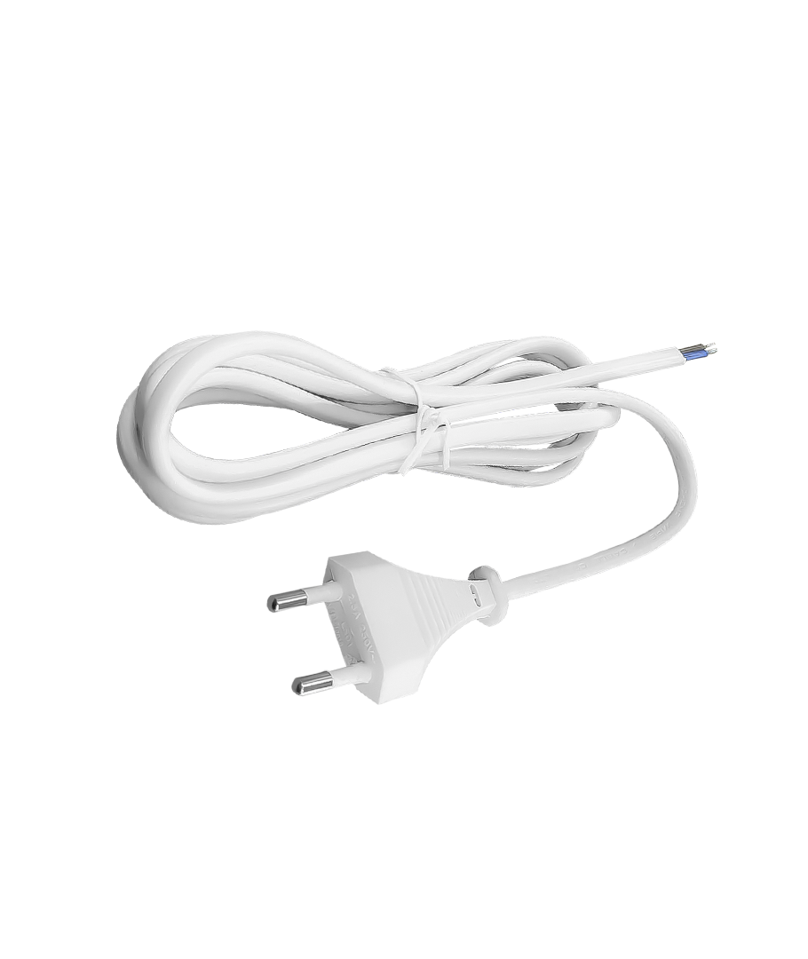 1,5 meter vit strömkabel med euro-kontakt och avisolerade ledningar.
