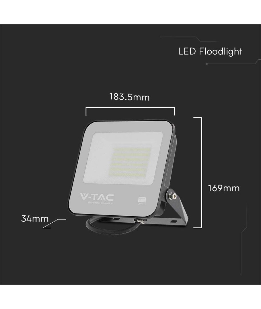 Med en kompakt dimension på 169 x 183,5 x 34 mm och ett vattentåligt hölje med IP65-klassificering, är denna strålkastare ideal för utomhusbruk. Den tål lätt både vattenstänk och regn.