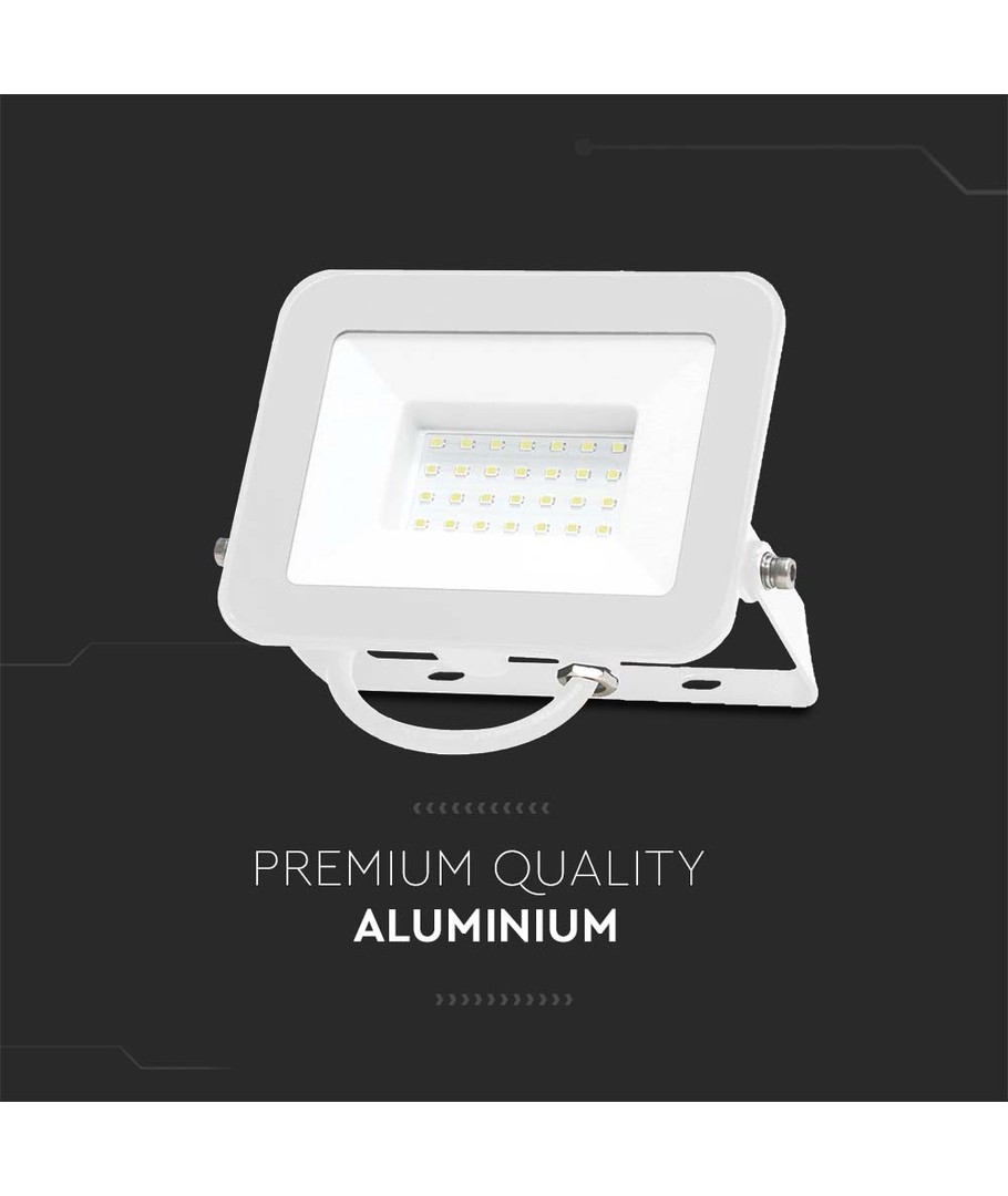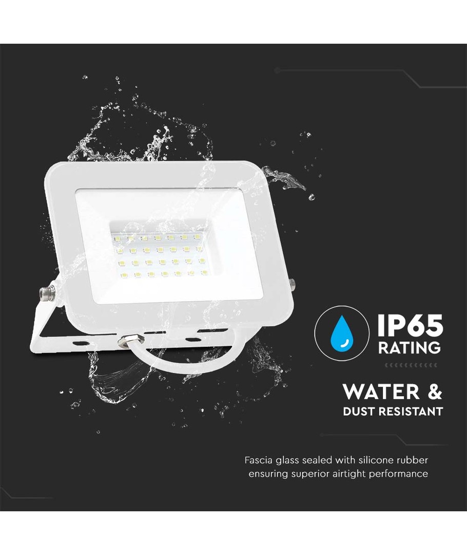 Med sitt vita hus och vita glas, har strålkastaren en stilren och modern design som lätt smälter in i olika miljöer. Tack vare dess IP65-klassning är den perfekt för utomhusbruk, vilket gör den resistent mot vattenstänk och regn.