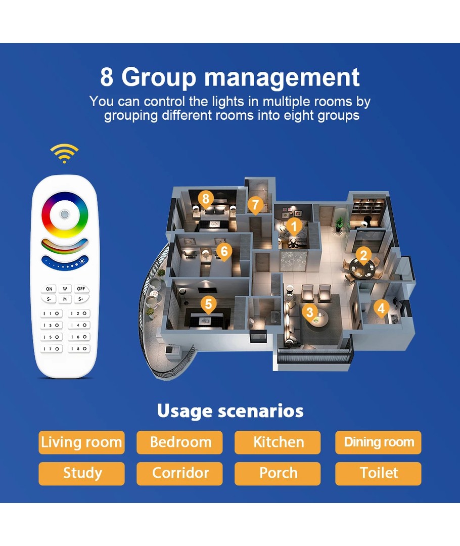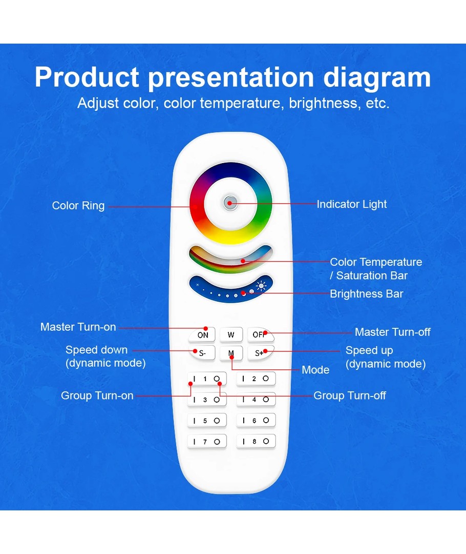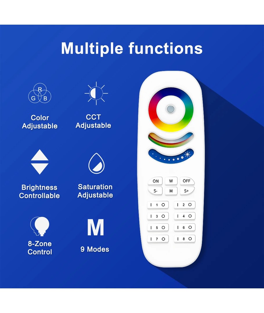 Upplev den ultimata flexibiliteten och kontrollen med Gledopto 8 zone RGB+CCT touch-fjärrkontrollen - designad för att ge dig en sömlös ljusupplevelse i upp till 8 zoner utan behov av ett Zigbee-hub.