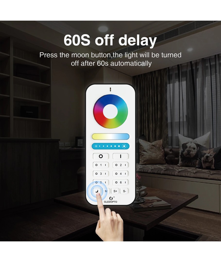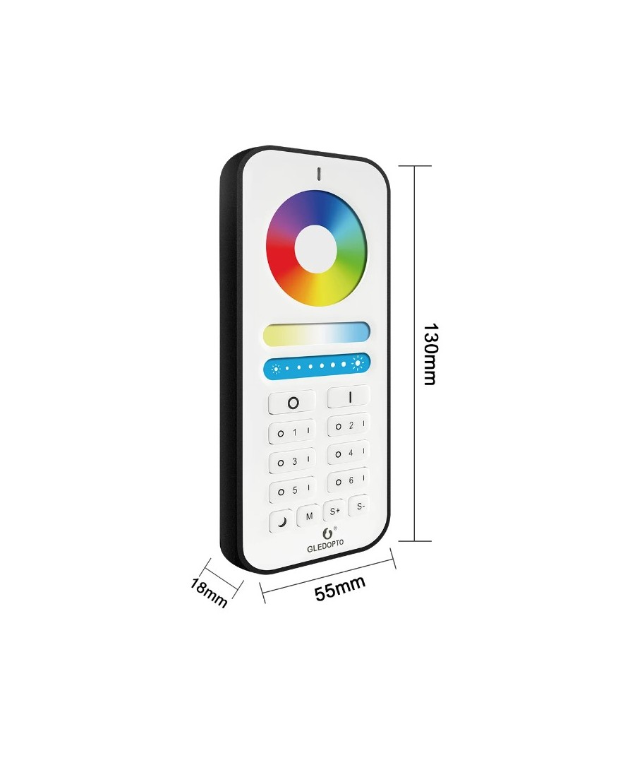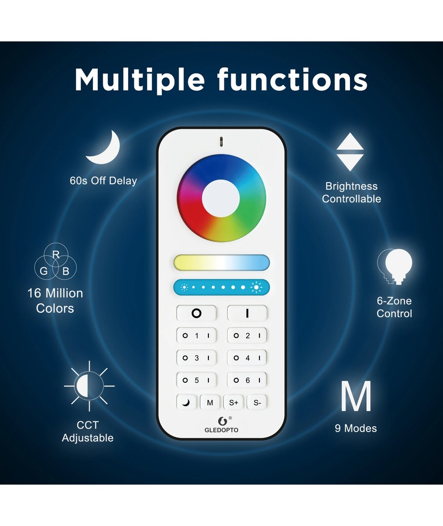 Upplev den ultimata flexibiliteten och kontrollen med Gledopto 6 zone RGB+CCT touch-fjärrkontrollen - designad för att ge dig en sömlös ljusupplevelse i upp till 6 zoner utan behov av ett Zigbee-hub.