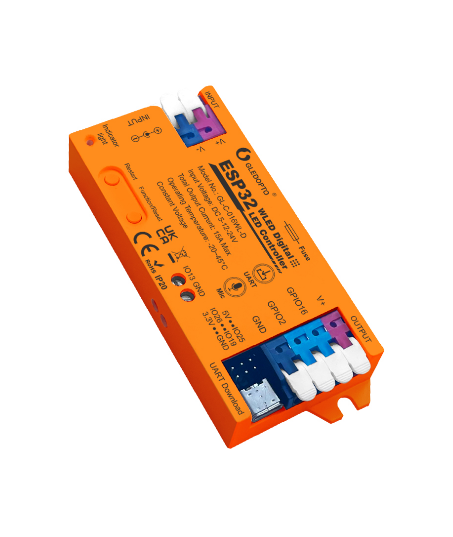 Gledopto ESP32 WLED IC-kontroller med klickterminaler.