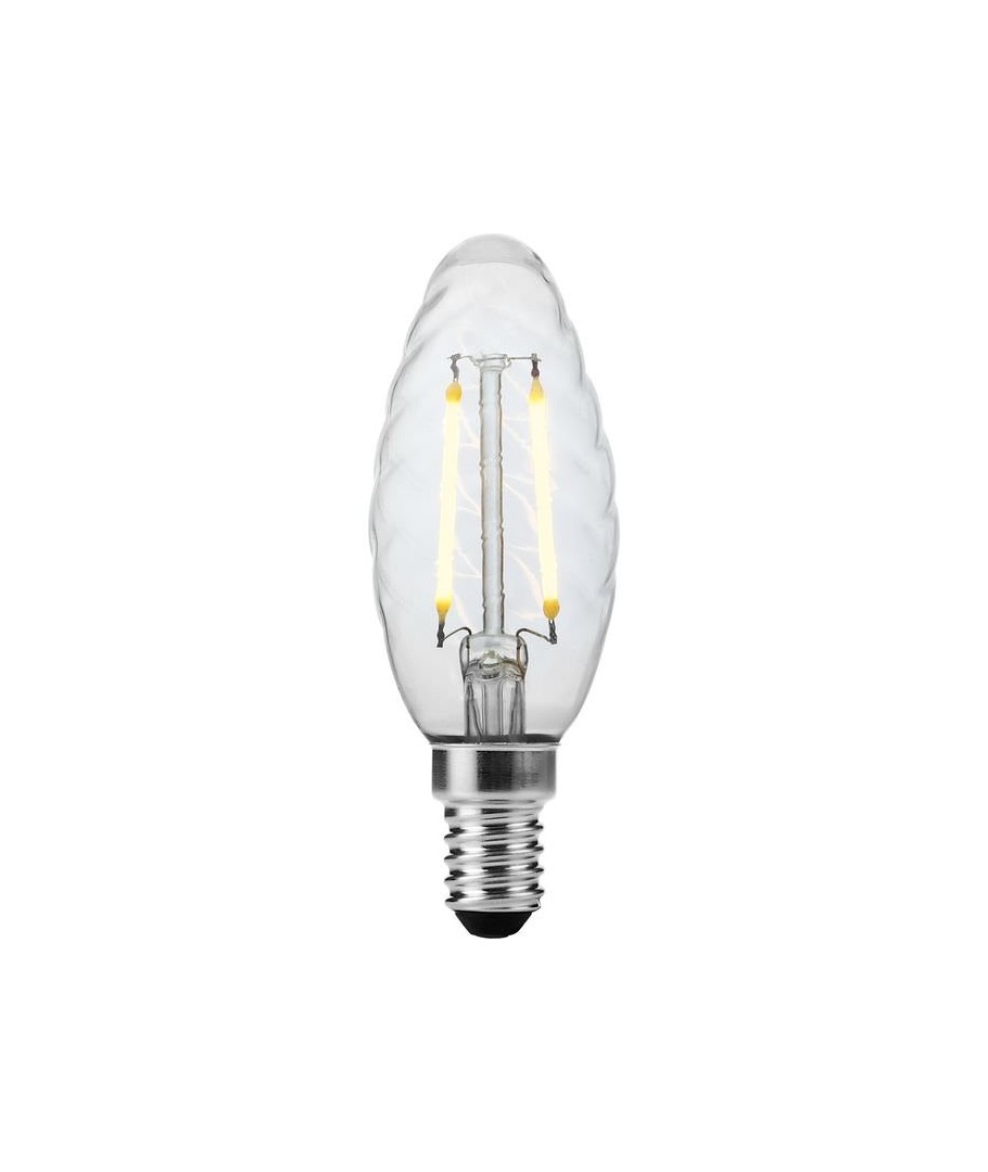 E14 2W dimbar LED-kronlampa är designad för att ge en varm och inbjudande belysning med klart glas och en dekorativ twisted candle-design.