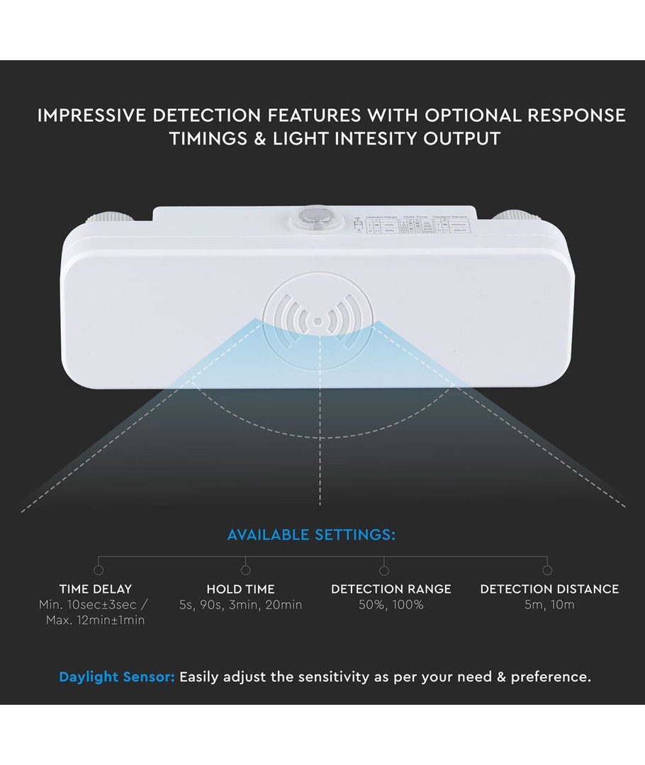 Sammantaget är denna mikrovågssensor en mångsidig och robust lösning som säkerställer effektiv ljusstyrning och energibesparing i både privata och kommersiella miljöer.