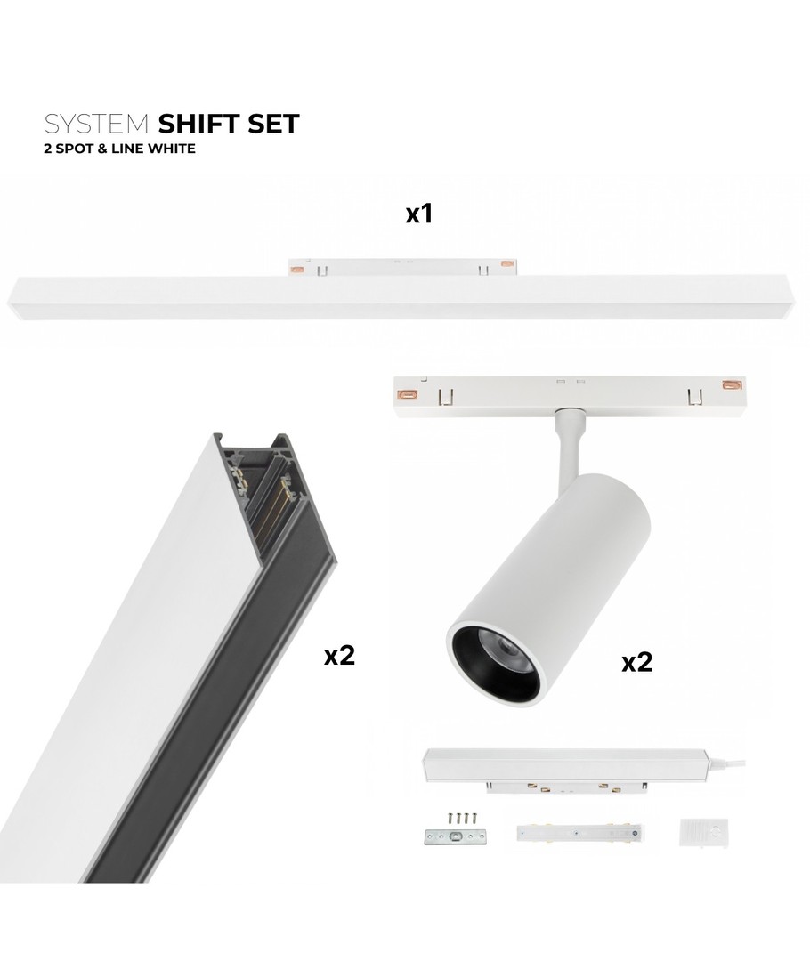 I detta SHIFT-set får du 2x 1 meters skenor, 2 LED-spottar och en ljusskena, samt allt du behöver för att installera setet.